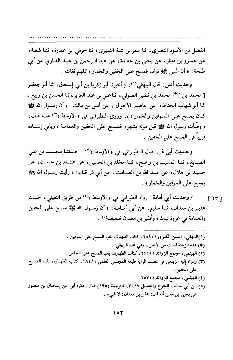 وحديث أنس: قال البيهقي: (أخبرنا أبو زكريا بن أبي إسحاق، ثنا أبو جعفر محمد بن محمد بن نصير الصوفي، ثنا علي بن عبد العزيز، ثنا الحسن بن ربيع، ثنا أبو شهاب الحناط، عن عاصم الأحول، عن أنس بن مالك: "أن رسول الله - صلى الله عليه وسلم - كان يمسح على الموقين والخمار"). وروى الطبراني في "الأوسط" عنه قال: "وضّأت رسول الله - صلى الله عليه وسلم - قبل موته بشهر، فمسح على الخفين والعمامة" ويأتي إسناده قريبًا في المسح على الخفين.