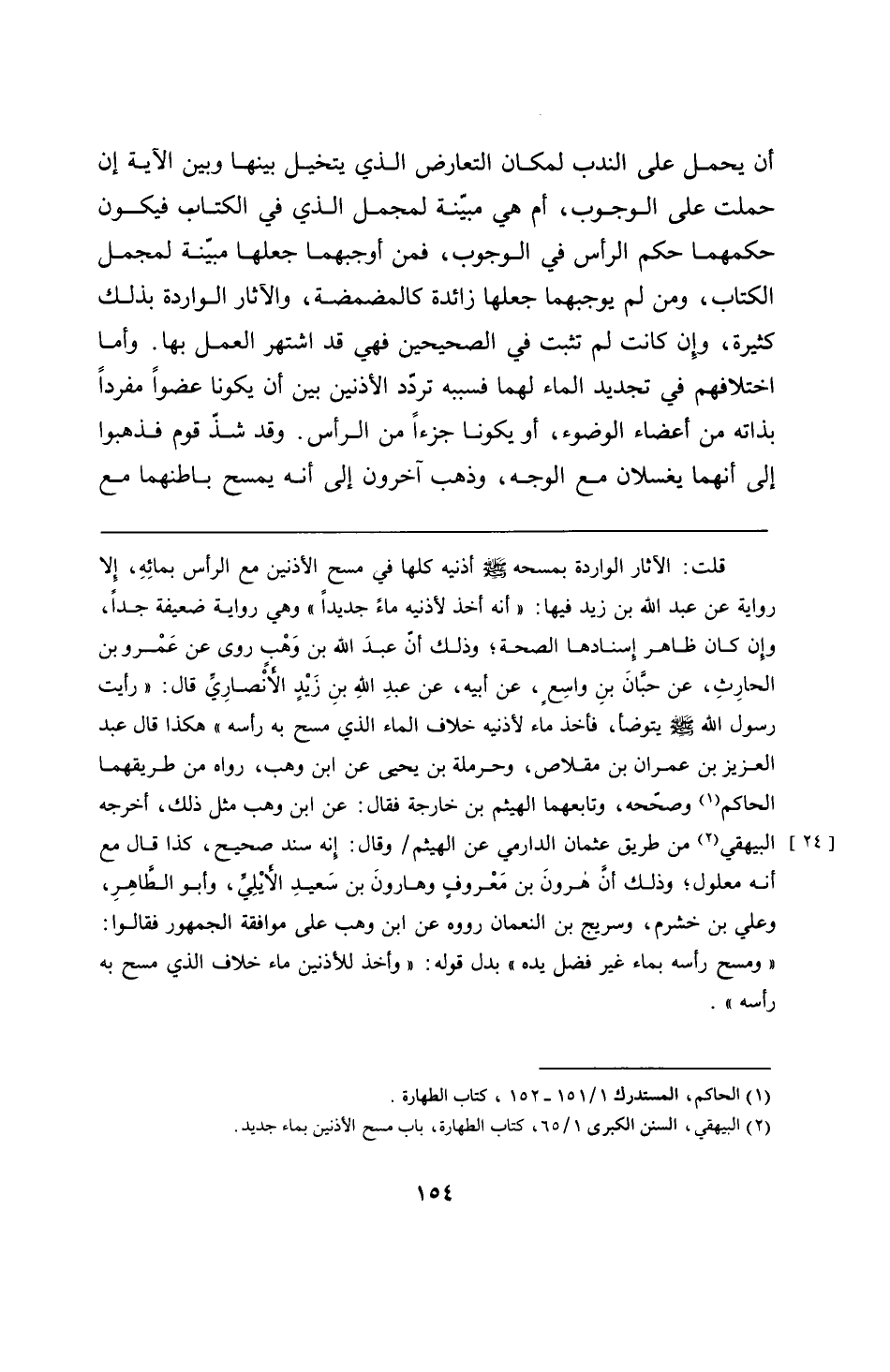 قلت: الآثار الواردة بمسحه - صلى الله عليه وسلم - أذنيه كلها في مسح الأذنين مع الرأس بمائِهِ، إِلا رواية عن عبد الله بن زيد فيها: "أنه أخذ لأذنيه ماءً جديدًا" وهي رواية ضعيفة جدًا، وإن كان ظاهر إِسنادها الصحة؛ وذلك أنّ عبدَ الله بن وَهْب روى عن عَمْرو بن الحارِثِ، عن حبَّانَ بنِ واسِعٍ، عن أبيه، عن عبدِ اللهِ بنِ زَيْدٍ الأَنْصارِيِّ قال: "رأيت رسول الله - صلى الله عليه وسلم - يتوضأ، فأخذ ماء لأذنيه خلاف الماء الذي مسح به رأسه" هكذا قال عبد العزيز بن عمران بن مقلاص، وحرملة بن يحيى عن ابن وهب، رواه من طريقهما الحاكم وصحّحه، وتابعهما الهيثم بن خارجة فقال: عن ابن وهب مثل ذلك، أخرجه البيهقي من طريق عثمان الدارمي عن الهيثم وقال: إنه سند صحيح، كذا قال مع أنه معلول؛ وذلك أنَّ هارونَ بن مَعْروفٍ وهارونَ بن سَعيدِ الأَيْلِىِّ، وأبو الطَّاهِرِ، وعلي بن خشرم، وسريج بن النعمان رووه عن ابن وهب على موافقة الجمهور فقالوا: "ومسح رأسه بماء غير فضل يده" بدل قوله: "وأخذ للأذنين ماء خلاف الذي مسح به رأسه".
