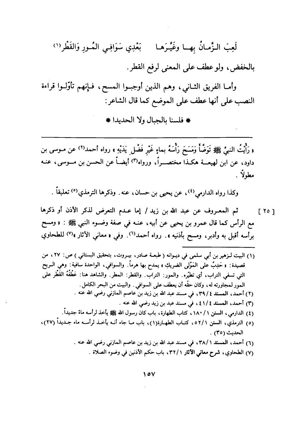 ثم المعروف عن عبد الله بن زيد إما عدم التعرض لذكر الأذن أو ذكرها مع الرأس كما قال عمرو بن يحيى عن أبيه، عنه في صفة وضوء النبي - صلى الله عليه وسلم -: "ومسح برأسه أقبل به وأدبر، ومسح بأذنيه". رواه أحمد. وفي "معاني الأثار" للطحاوي