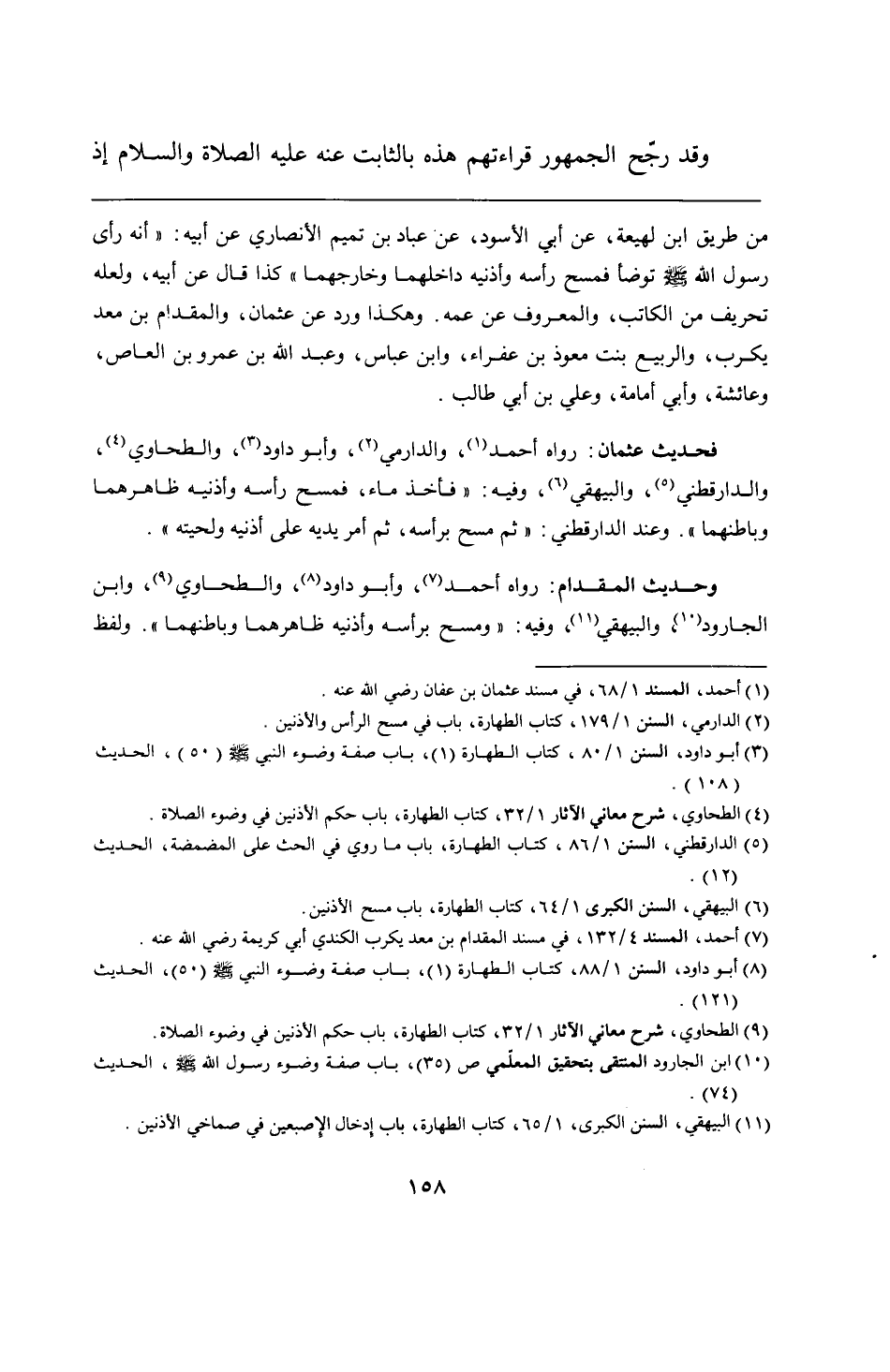 من طريق ابن لهيعة، عن أبي الأسود، عن عباد بن تميم الأنصاري عن أبيه: "أنه رأى رسول الله - صلى الله عليه وسلم - توضأ فمسح رأسه وأذنيه داخلهما وخارجهما" كذا قال عن أبيه، ولعله تحريف من الكاتب، والمعروف عن عمه. وهكذا ورد عن عثمان، والمقدام بن معد يكرب، والربيع بنت معوذ بن عفراء، وابن عباس، وعبد الله بن عمرو بن العاص، وعائشة، وأبي أمامة، وعلي بن أبي طالب.