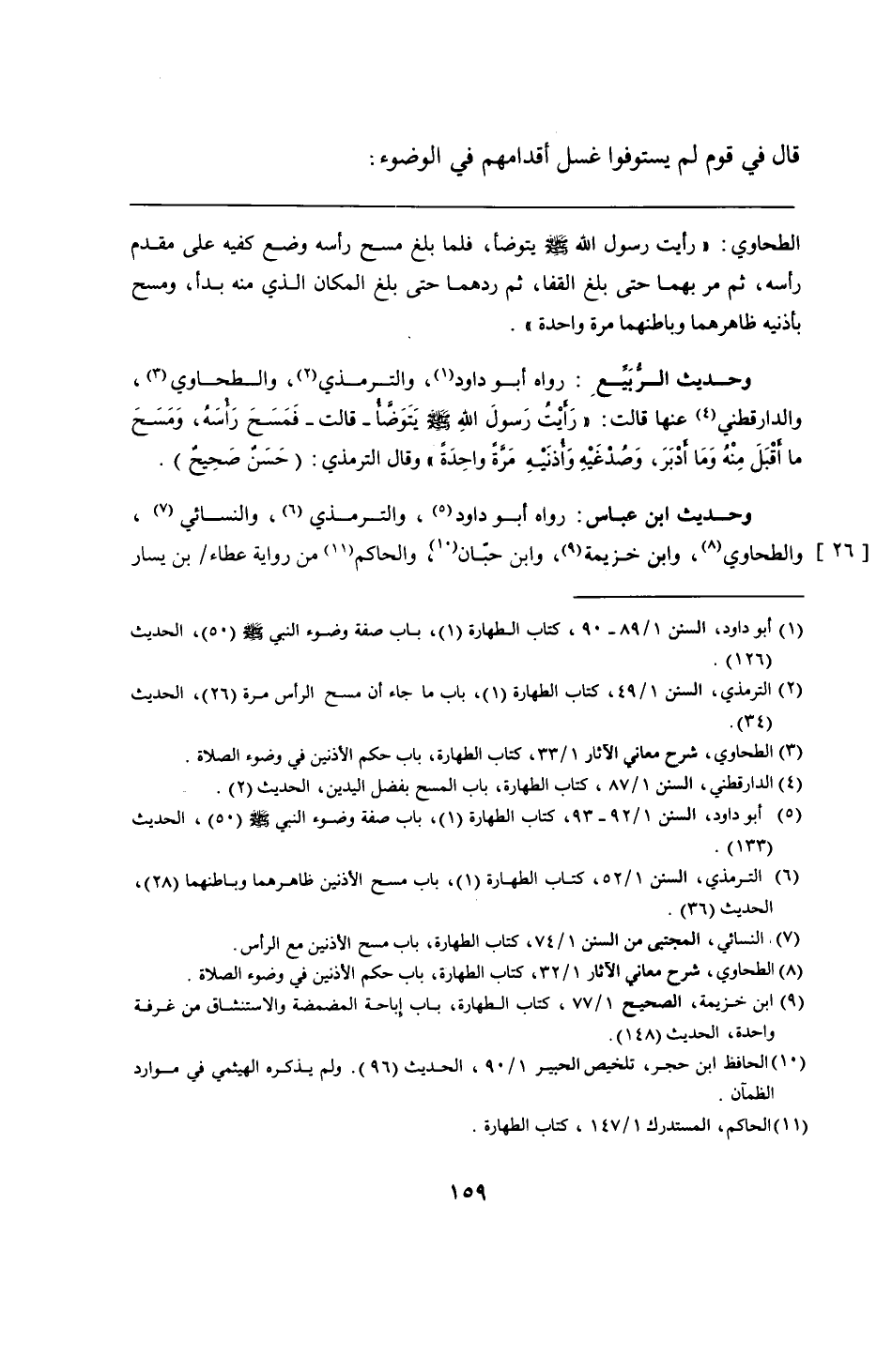 الطحاوي: "رأيت رسول الله - صلى الله عليه وسلم - يتوضأ، فلما بلغ مسح رأسه وضع كفيه على مقدم رأسه، ثم مر بهما حتى بلغ القفا، ثم ردهما حتى بلغ المكان الذي منه بدأ، ومسح بأذنيه ظاهرهما وباطنهما مرّة واحدة".