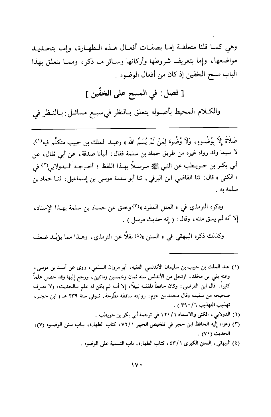 صَلاَةَ إِلَّا بِوُضُوءٍ، وَلاَ وُضُوءَ لِمَنْ لَمْ يُسَمِّ اللهَ" وعبد الملك بن حبيب متكلَّم فيه، لاسيما وقد رواه غيره من طريق حماد بن سلمة فقال: أنبأنا صدقة، عن أبي ثفال، عن أبي بكر بن حويطب عن النبي - صلى الله عليه وسلم - مرسلًا بهذا اللفظ؛ أخرجه الدولابي في "الكنى" قال: ثنا القاضي ابن البرقي، ثنا أبو سلمة موسى بن إِسماعيل، ثنا حماد بن سلمة به.