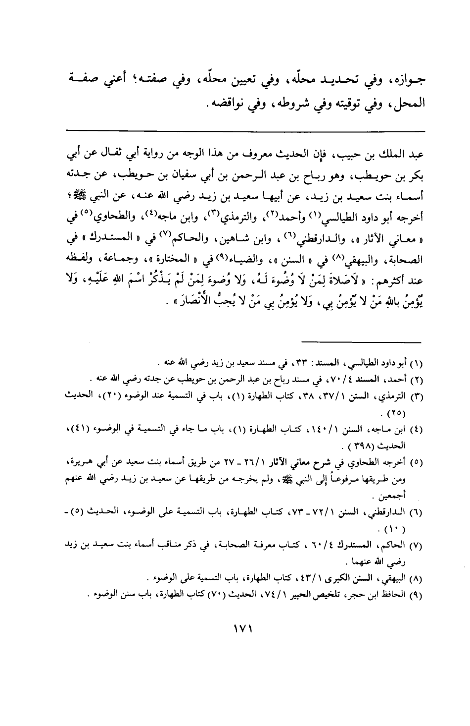 عبد الملك بن حبيب، فإن الحديث معروف من هذا الوجه من رواية أبي ثفال عن أبي بكر بن حويطب، وهو رباح بن عبد الرحمن بن أبي سفيان بن حويطب، عن جدته أسماء بنت سعيد بن زيد، عن أبيها سعيد بن زيد - رضي الله عنه -، عن النبي - صلى الله عليه وسلم -؛ أخرجه أبو داود الطيالسي وأحمد، والترمذي، وابن ماجه، والطحاوي في "معاني الآثار"، والدارقطني، وابن شاهين، والحاكم في "المستدرك" في الصحابة، والبيهقي في "السنن"، والضياء في "المختارة"، وجماعة، ولفظه عند أكثرهم: "لَاصَلاةَ لمَنْ لَا وُضُوءَ لَهُ، وَلا وُضوءَ لمَنْ لَمْ يَذْكُرْ اسْمَ اللهِ عَلَيْهِ، وَلا يؤمِنُ باللهِ مَنْ لا يؤمِنُ بِي، وَلا يُؤمِنُ بِي مَنْ لا يُحِبُّ الأَنْصَارَ".