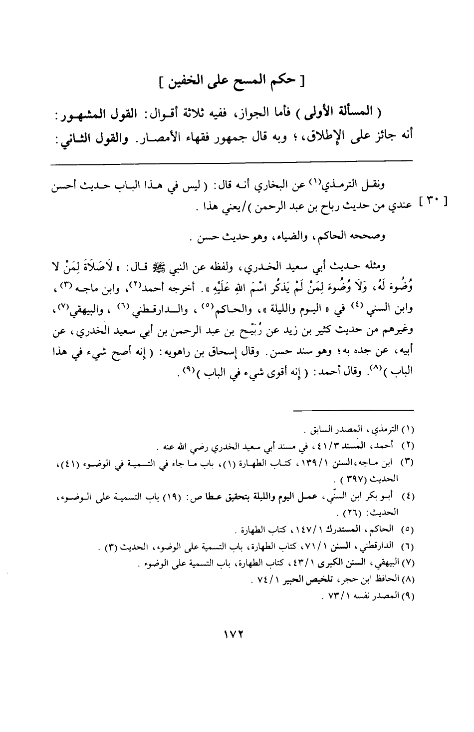 ومثله حديث أبي سعيد الخدري، ولفظه عن النبي - صلى الله عليه وسلم - قال: "لَاصَلَاةَ لِمَنْ لا وُضُوءَ لَهُ، وَلَا وُضُوءَ لِمَنْ لَمْ يَذكُر اسْمَ اللهِ عَلَيْهِ". أخرجه أحمد، وابن ماجه، وابن السني في "اليوم والليلة"، والحاكم، والدارقطني، والبيهقي، وغيرهم من حديث كثير بن زيد عن رُبيْح بن عبد الرحمن بن أبي سعيد الخدري، عن أبيه، عن جده به؛ وهو سند حسن. وقال إِسحاق بن راهويه: (إنه أصح شيء في هذا الباب). وقال أحمد: (إِنه أقوى شيء في الباب).