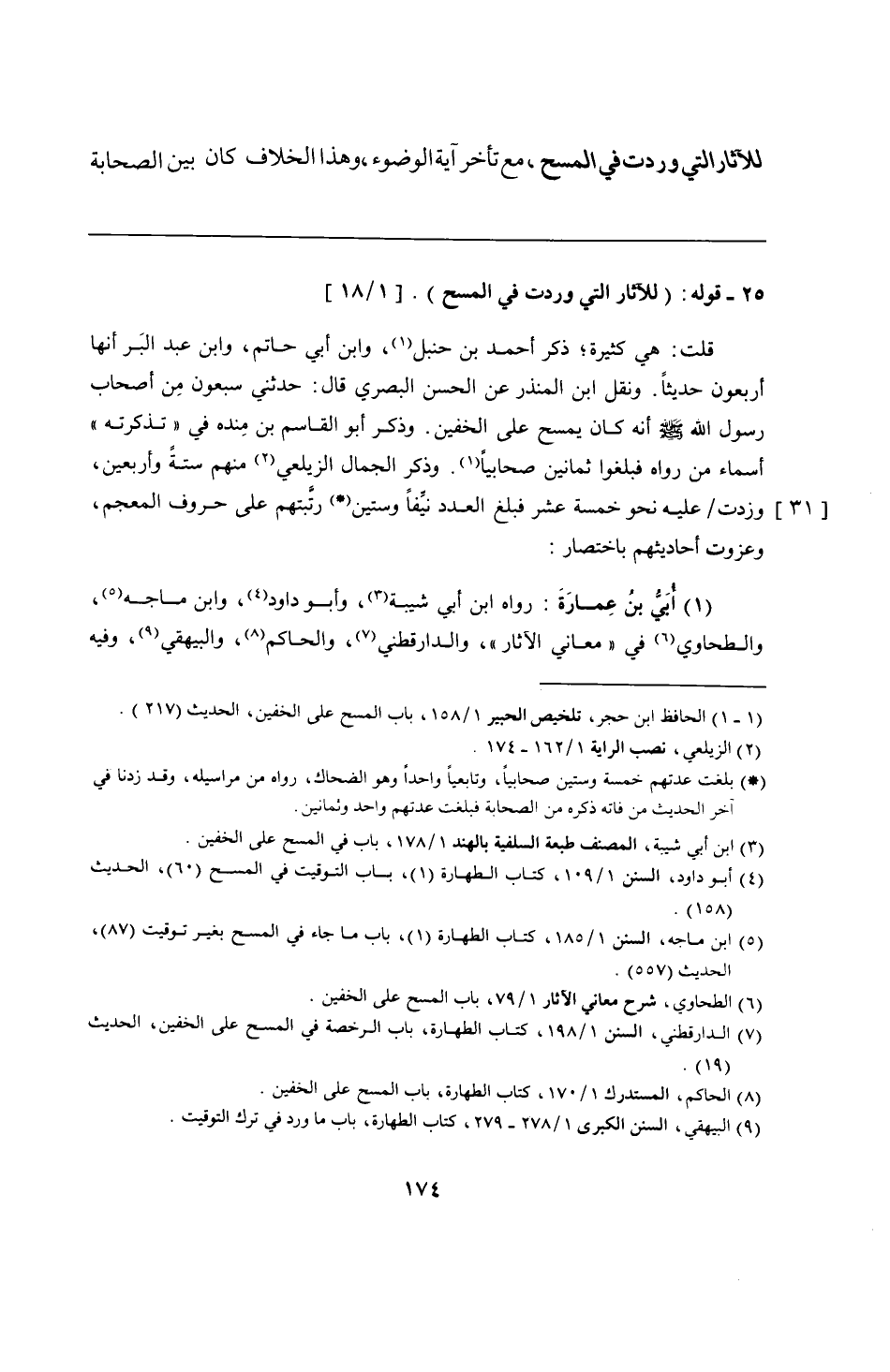 قلت: هي كثيرة؛ ذكر أحمد بن حنبل، وابن أبي حاتم، وابن عبد البَر أنها أربعون حديثًا. ونقل ابن المنذر عن الحسن البصري قال: حدثني سبعون مِن أصحاب رسول الله - صلى الله عليه وسلم - أنه كان يمسح على الخفين. وذكر أبو القاسم بن مِنده في "تذكرته" أسماء من رواه فبلغوا ثمانين صحابيًا. وذكر الجمال الزيلعي منهم ستةً وأربعين، وزدت عليه نحو خمسة عشر فبلغ العدد نيِّفًا وستين رتَّبتهم على حروف المعجم، وعزوت أحاديثهم باختصار:
