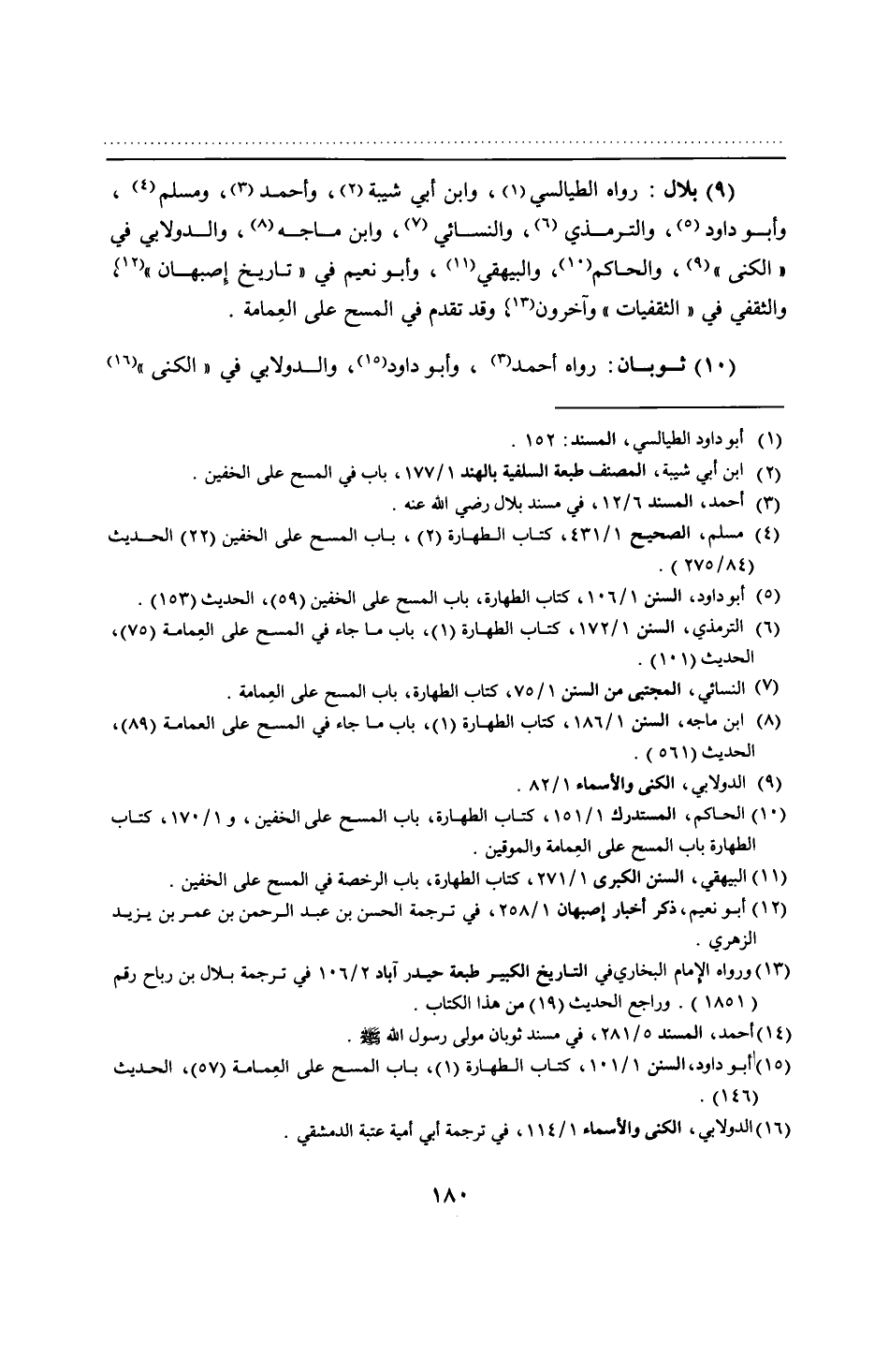 (9) بلال: رواه الطيالسي، وابن أبي شيبة، وأحمد، ومسلم، وأبو داود، والترمذي، والنسائي، وابن ماجه، والدولابي في "الكنى"، والحاكم، والبيهقي، وأبو نعيم في "تاريخ إِصبهان" , والثقفي في "الثقفيات" وآخرون , وقد تقدم في المسح على العِمامة.