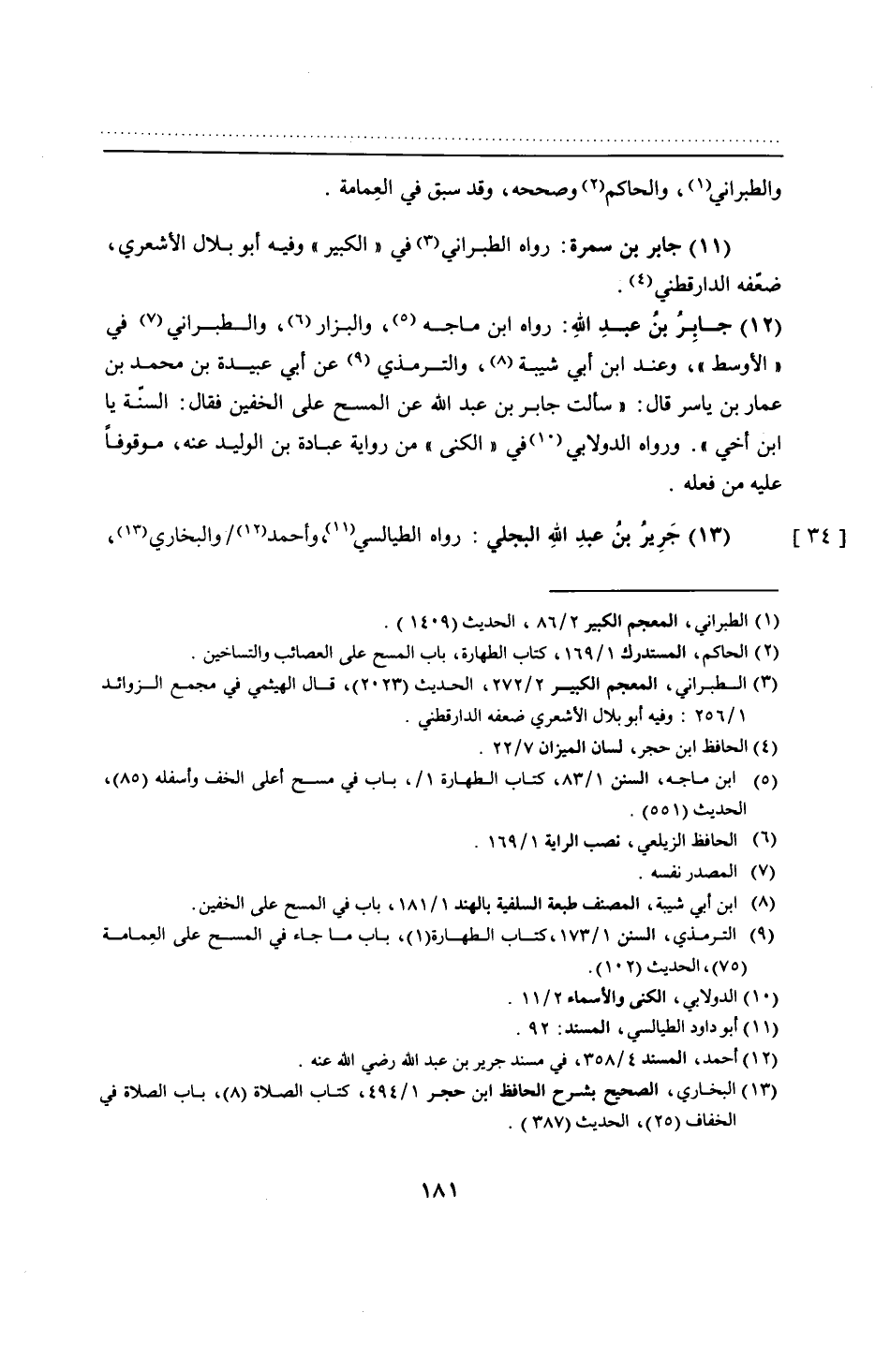 (12) جابِرُ بنُ عبدِ اللهِ: رواه ابن ماجه، والبزار، والطبراني في "الأوسط"، وعند ابن أبي شيبة، والترمذي عن أبي عبيدة بن محمد بن عمار بن ياسر قال: "سألت جابر بن عبد الله عن المسح على الخفين فقال: السنّة يا ابن أخي". ورواه الدولابي في "الكنى" من رواية عبادة بن الوليد عنه، موقوفًا عليه من فعله.