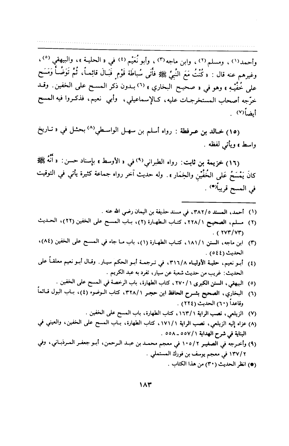 (16) خزيمة بن ثابت: رواه الطبراني في "الأوسط" بإسناد حسن: "أَنَّةُ - صلى الله عليه وسلم - كانَ يَمْسَحُ عَلى الخُفَّيْنِ والخِمَار". وله حديث آخر رواه جماعة كثيرة يأتي في التوقيت في المسح قريبًا.