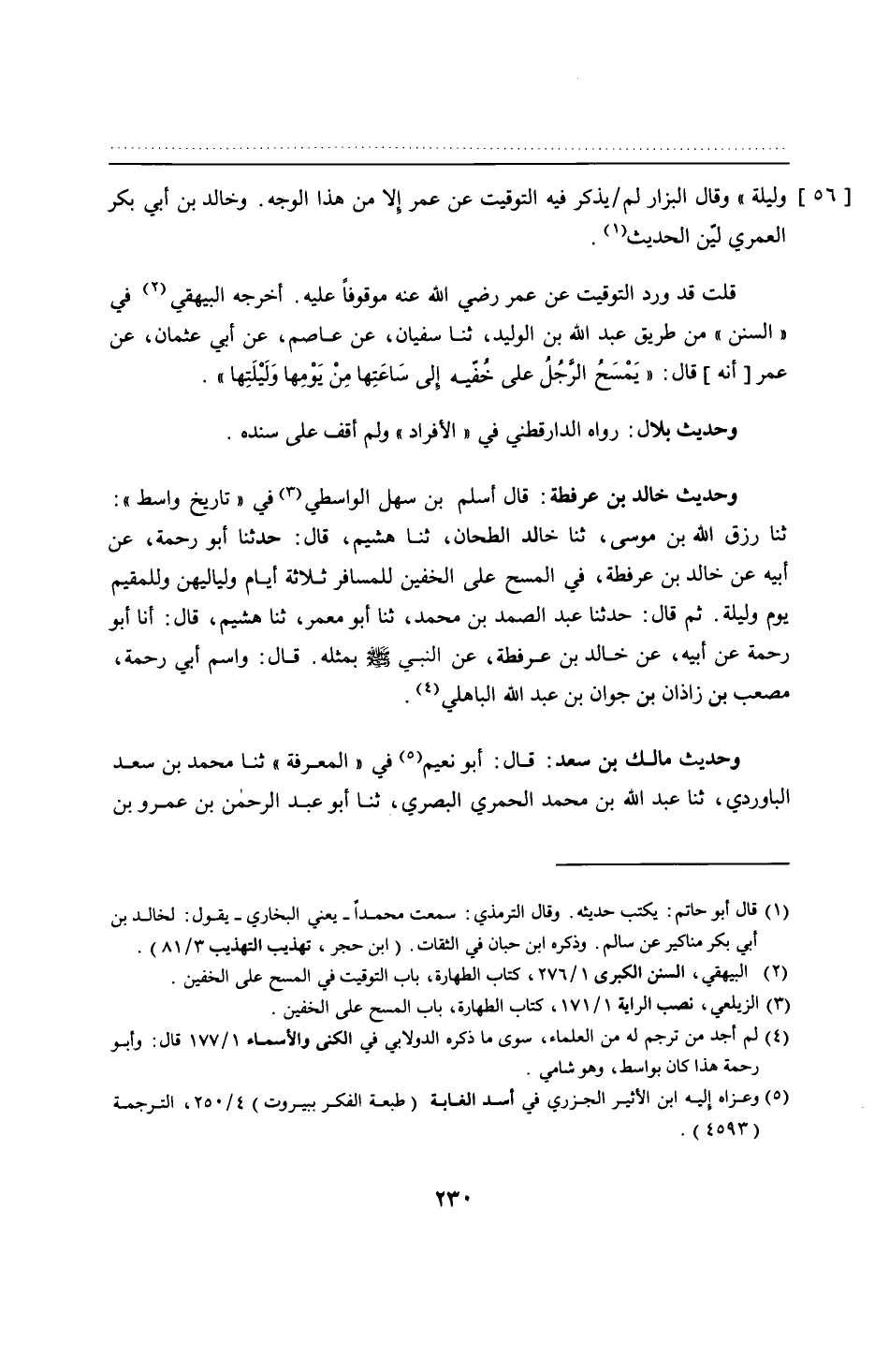 وحديث خالد بن عرفطة: قال أسلم بن سهل الواسطي في "تاريخ واسط": ثنا رزق الله بن موسى، ثنا خالد الطحان، ثنا هشيم، قال: حدثنا أبو رحمة، عن أبيه عن خالد بن عرفطة، في المسح على الخفين للمسافر ثلاثة أيام ولياليهن وللمقيم يوم وليلة. ثم قال: حدثنا عبد الصمد بن محمد، ثنا أبو معمر، ثنا هشيم، قال: أنا أبو رحمة عن أبيه، عن خالد بن عرفطة، عن النبي - صلى الله عليه وسلم - بمثله. قال: واسم أبي رحمة، مصعب بن زاذان بن جوان بن عبد الله الباهلي.