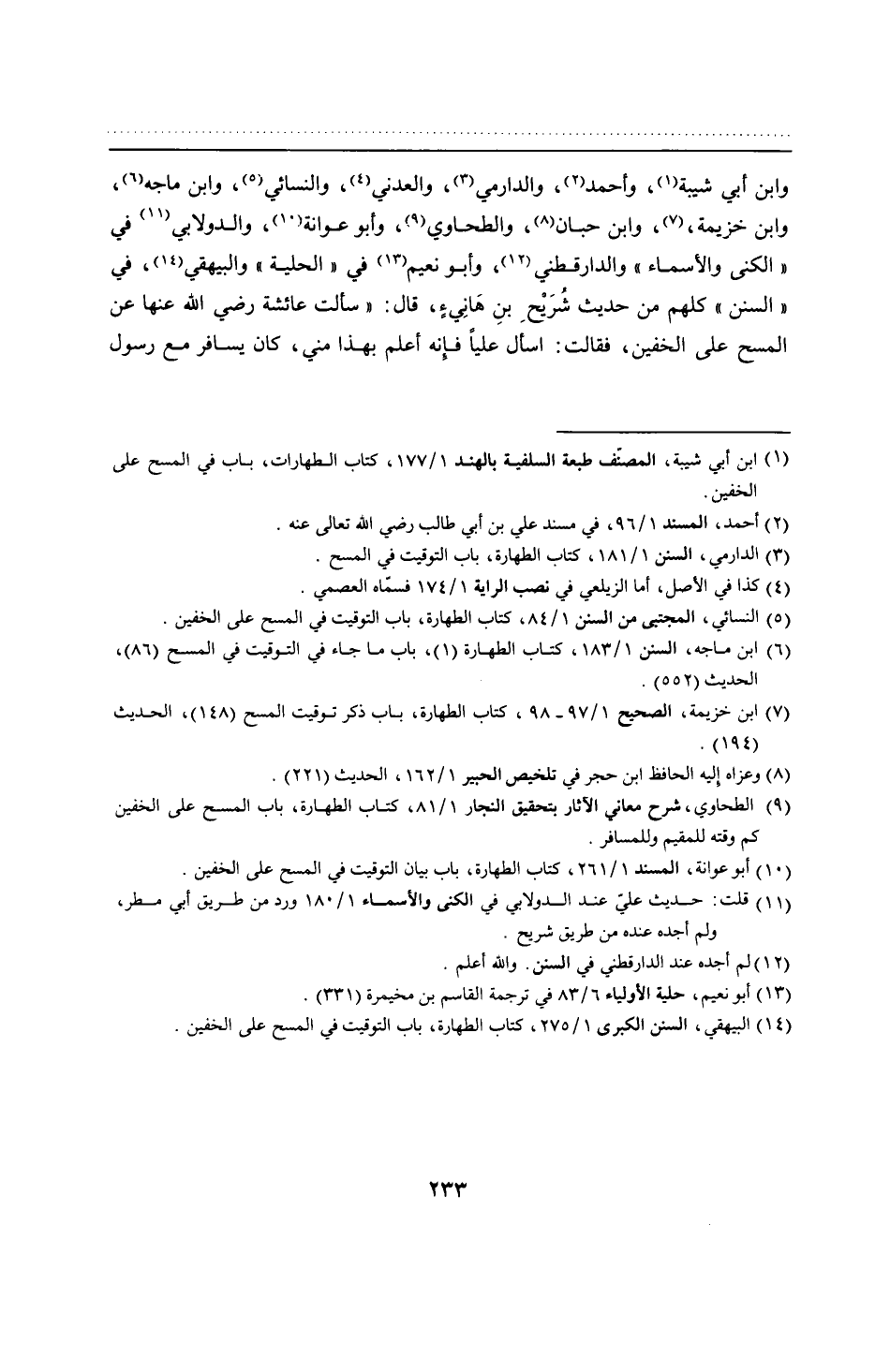 وابن أبي شيبة، وأحمد، والدارمي، والعدني، والنسائي، وابن ماجه، وابن خزيمة، وابن حبان، والطحاوي، وأبو عوانة، والدولابي في "الكنى والأسماء" والدارقطني، وأبو نعيم في "الحلية" والبيهقي، في "السنن" كلهم من حديث شُرَيْحِ بنِ هَانِيءٍ، قال: "سألت عائشة - رضي الله عنها - عن المسح على الخفين، فقالت: اسأل عليًا فإنه أعلم بهذا مني، كان يسافر مع رسول