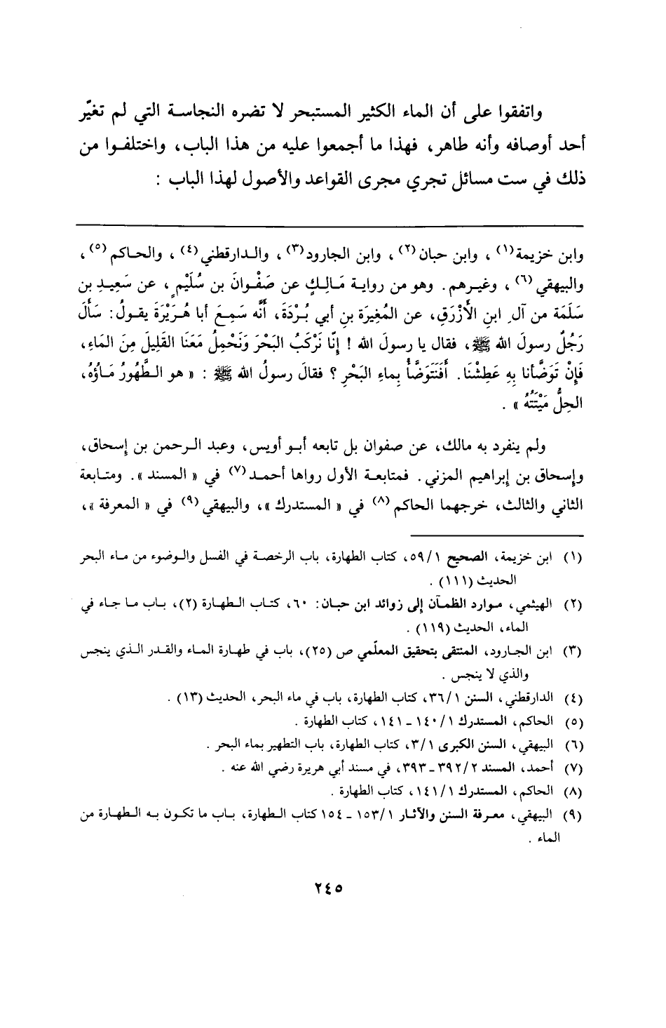 وابن خزيمة، وابن حبان، وابن الجارود، والدارقطني، والحاكم، والبيهقي، وغيرهم. وهو من رواية مَالِك عن صَفْوانَ بن سُلَيْمٍ، عن سَعِيدِ بن سَلَمَة من آلِ ابنِ الأزْرَقِ، عن المُغِيرَة بنِ أبيِ بُرْدَةَ، أنَّه سَمِعَ أبا هُرَيْرَةَ يقول: سَألَ رَجُلٌ رسولَ الله - صلى الله عليه وسلم -، فقال يا رسولَ الله! إنّا نرْكَبُ البَحْرَ وَنَحْمِلُ مَعَنَا القَلِيلَ مِنَ المَاءِ، فَإِنْ تَوَضَّأنا بِهِ عَطِشْنَا. أفَنَتَوَضأُ بِماءِ البَحْرِ؟ فقالَ رسولُ الله - صلى الله عليه وسلم -: "هو الطَّهُورُ مَاؤُهُ، الحِلُّ مَيْتَتُه".