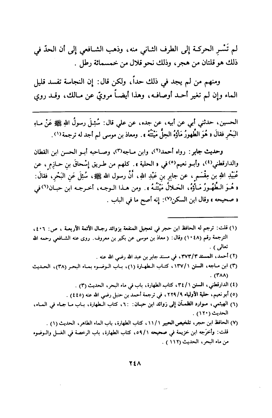 الحسين، حدثني أبي عن أبيه، عن جده، عن علي قال: سُئِلَ رسولُ اللهِ - صلى الله عليه وسلم - عَنْ ماءِ البَحْرِ فقالَ "هُوَ الطهورُ مَاؤُهُ الحِلُّ مَيتَتُهُ". ومعاذ بن موسى لم أجد له ترجمة.