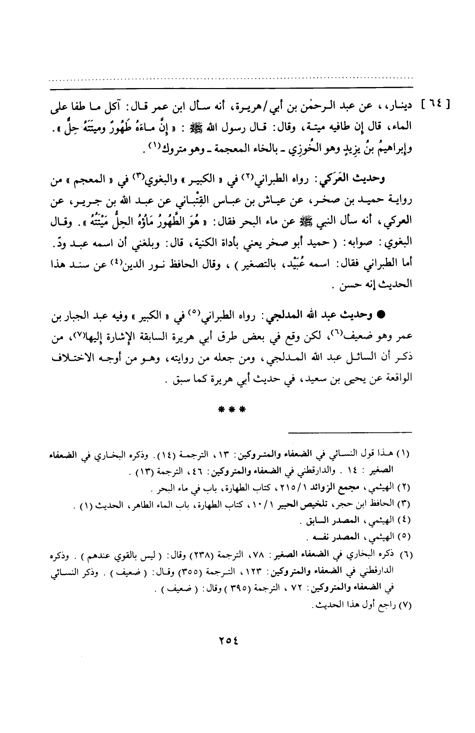 وحديث العَرَكي: رواه الطبراني في "الكبير" والبغوي في "المعجم" من رواية حميد بن صخر، عن عياش بن عباس القِتْباني عن عبد الله بن جرير، عن العركي، أنه سأل النبي - صلى الله عليه وسلم - عن ماء البحر فقال: "هوَ الطَّهُورُ مَاؤُهُ الحِل مَيْتَتُة". وقال البغوي: صوابه: (حميد أبو صخر يعني بأداة الكنية، قال: وبلغني أن اسمه عبد ودّ. أما الطبراني فقال: اسمه عُبَيْد، بالتصغير)، وقال الحافظ نور الدين عن سند هذا الحديث إنه حسن.