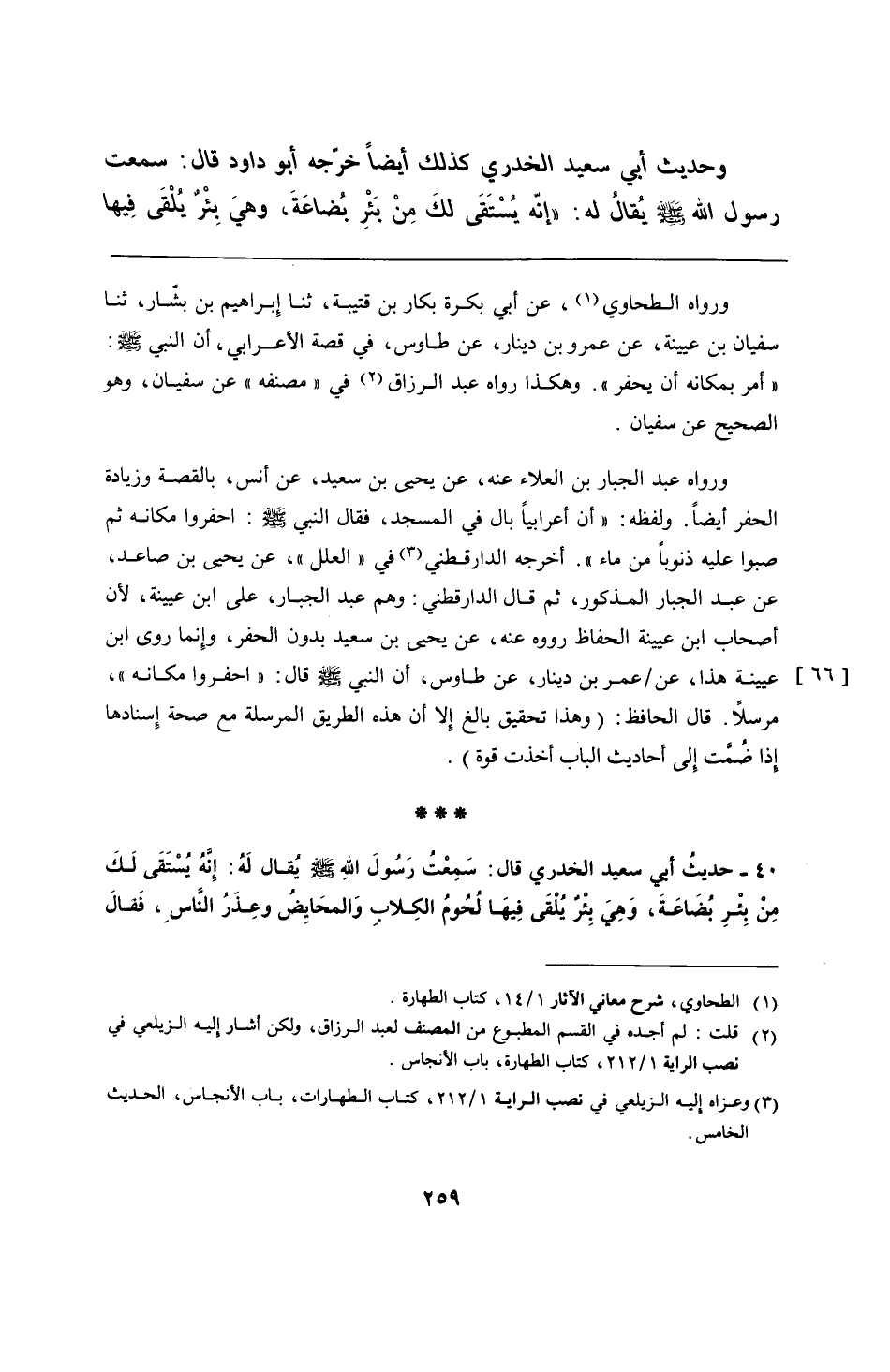ورواه عبد الجبار بن العلاء عنه، عن يحيى بن سعيد، عن أنس، بالقصة وزيادة الحفر أيضًا. ولفظه: "أن أعرابيًا بال في المسجد، فقال النبي - صلى الله عليه وسلم -: احفروا مكانه ثم صبوا عليه ذنوبًا من ماء". أخرجه الدارقطني في "العلل"، عن يحيى بن صاعد، عن عبد الجبار المذكور، ثم قال الدارقطني: وهم عبد الجبار، على ابن عيينة، لأن أصحاب ابن عيينة الحفاظ رووه عنه، عن يحيى بن سعيد بدون الحفر، وإِنما روى ابن عيينة هذا، عن عمر بن دينار، عن طاوس، أن النبي - صلى الله عليه وسلم - قال: "احفروا مكانه"، مرسلًا. قال الحافظ: (وهذا تحقيق بالغ إِلا أن هذه الطريق المرسلة مع صحة إِسنادها إذا ضُمَّت إِلى أحاديث الباب أخذت قوة).