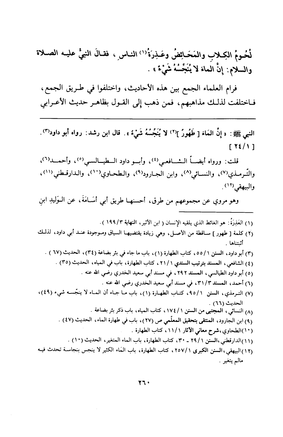 النبي - صلى الله عليه وسلم -: "إن المَاءَ طَهُورٌ لا يُنَجِّسُهُ شَيءٌ". قال ابن رشد: رواه أبو داود.