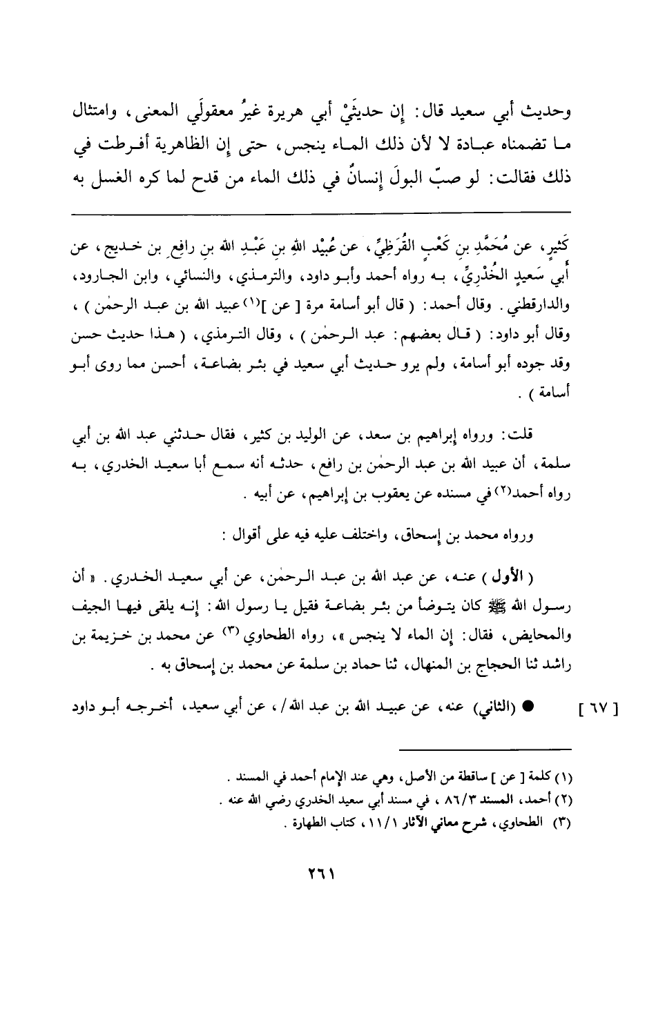 كَثيرٍ، عن مُحَمَّدِ بنِ كَعْبٍ القُرَظِيِّ، عن عُبيْد اللهِ بنِ عَبْدِ الله بنِ رافِعِ بن خديج، عن أبي سَعيدٍ الخُدْرِيَّ، به رواه أحمد وأبو داود، والترمذي، والنسائي، وابن الجارود، والدارقطني. وقال أحمد: (قال أبو أسامة مرة عن عبيد الله بن عبد الرحمن)، وقال أبو داود: (قال بعضهم: عبد الرحمن)، وقال الترمذي، (هذا حديث حسن وقد جوده أبو أسامة، ولم يرو حديث أبي سعيد في بئر بضاعة، أحسن مما روى أبو أسامة).