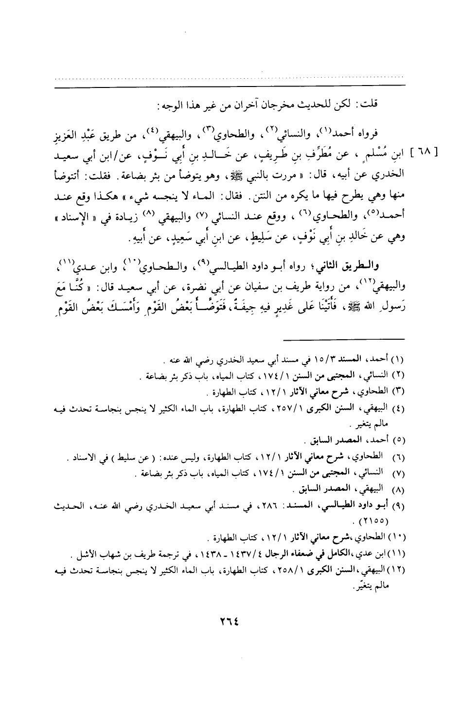 فرواه أحمد، والنسائي، والطحاوي، والبيهقي، من طريق عَبْدِ العَزيزِ ابنِ مُسْلمٍ، عن مُطَرِّفِ بنِ طَرِيفٍ، عن خَالدِ بنِ أبِى نَوْفٍ، عن ابن أبي سعيد الخدري عن أبيه، قال: "مررت بالنبي - صلى الله عليه وسلم -، وهو يتوضأ من بئر بضاعة. فقلت: أتتوضأ منها وهي يطرح فيها ما يكره من النتن. فقال: الماء لا ينجسه شيء" هكذا وقع عند أحمد، والطحاوي، ووقع عند النسائي والبيهقي زيادة في "الإِسناد" وهي عن خَالدِ بنِ أبِي نَوْفٍ، عن سَلِيطٍ، عن ابنِ أَبي سَعِيدٍ، عن أَبيهِ.