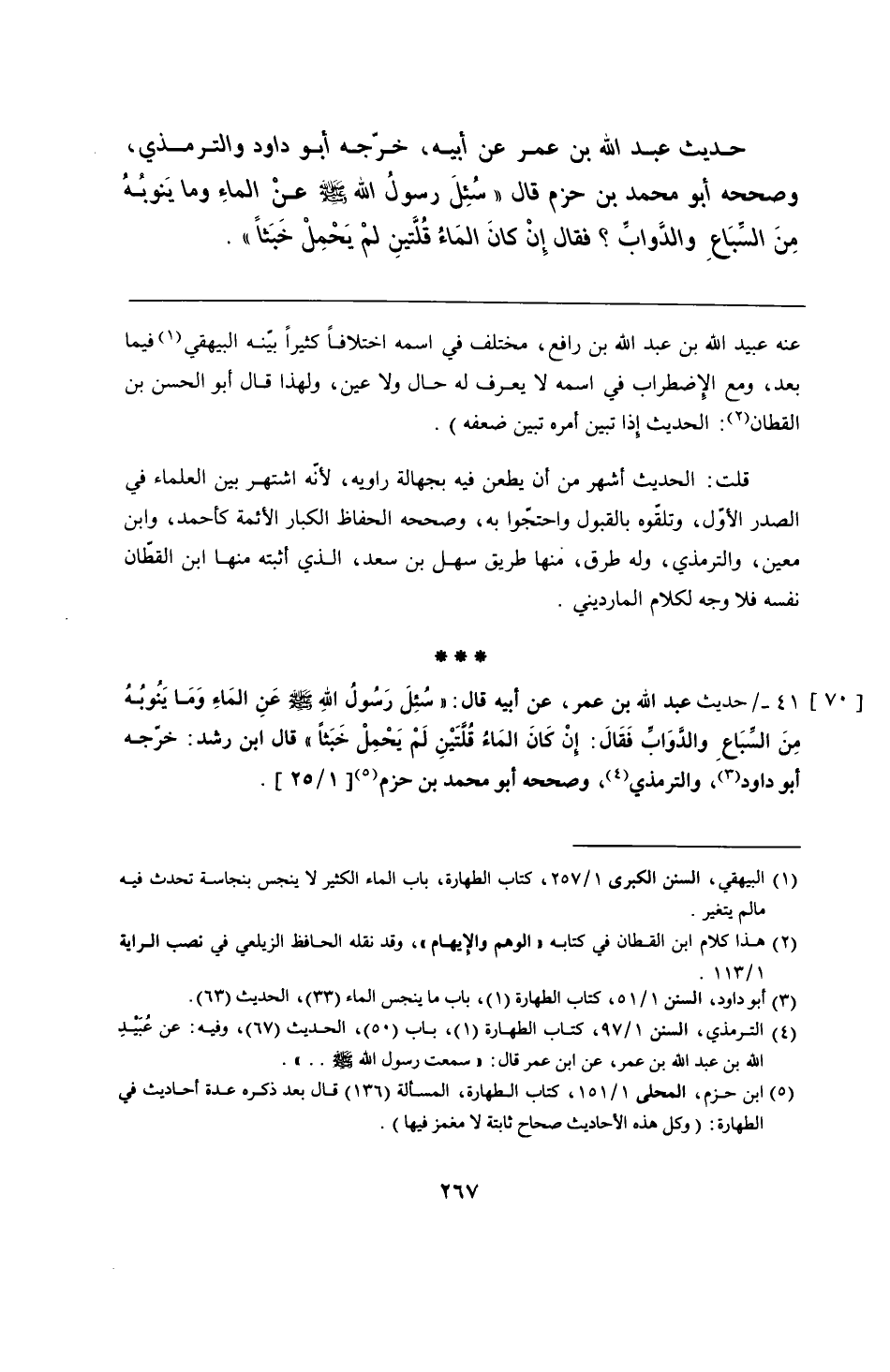 41 - حديث عبد الله بن عمر، عن أبيه قال: "سُئِلَ رَسُولُ اللهِ - صلى الله عليه وسلم - عَنِ المَاءِ وَمَا يَنُوبُهُ مِنَ السِّبَاعِ والدَّوَابِّ فَقَالَ: إنْ كَانَ المَاءُ قُلَّتَيْنِ لَمْ يَحْمِلْ خَبَثًا" قال ابن رشد: خرّجه أبو داود، والترمذي، وصححه أبو محمد بن حزم.