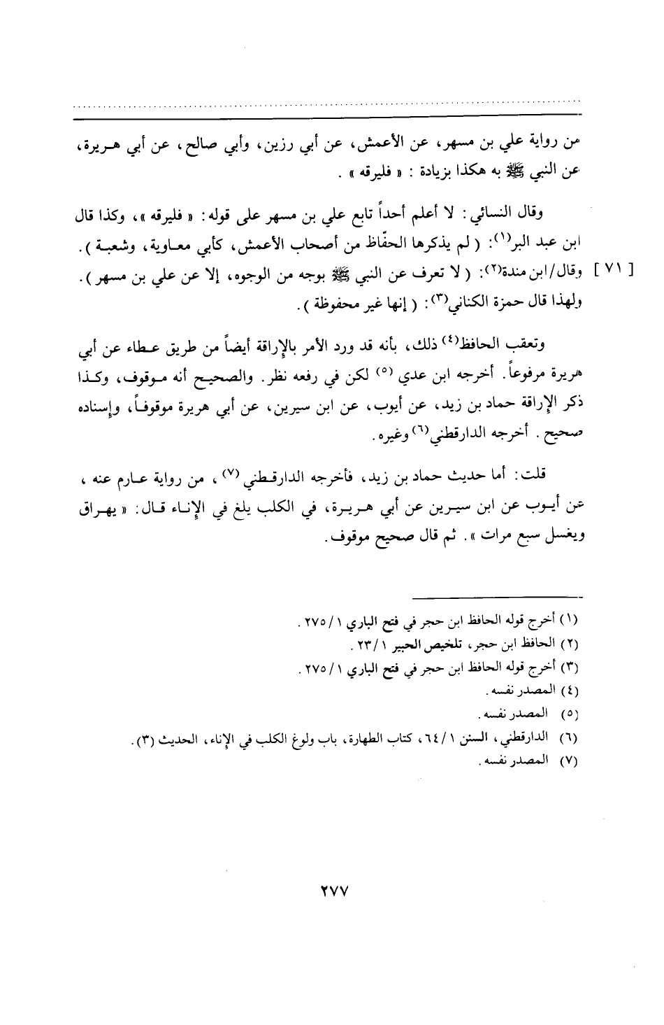 وقال النسائي: لا أعلم أحدًا تابع علي بن مسهر على قوله: "فليرقه"، وكذا قال ابن عبد البر: (لم يذكرها الحفّاظ من أصحاب الأعمش، كأبي معاوية، وشعبة). وقال ابن مندة: (لا تعرف عن النبي - صلى الله عليه وسلم - بوجه من الوجوه، إلا عن علي بن مسهر). ولهذا قال حمزة الكناني: (إنها غير محفوظة).