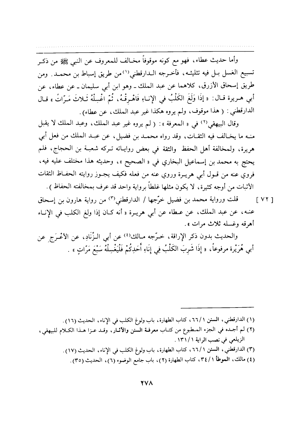وأما حديث عطاء، فهو مع كونه موقوفًا مخالف للمعروف عن النبي - صلى الله عليه وسلم - من ذكر تسبيع الغسل بل فيه تثليثه، فأخرجه الدارقطني من طريق إسباط بن محمد. ومن طريق إسحاق الأزرق، كلاهما عن عبد الملك -وهو ابن أبىِ سليمان- عن عطاء، عن أبي هريرة قال: "إذَا وَلَغَ الكَلْبُ في الإِناءِ فَاهْرِقْهُ، ثُمَّ اغْسِلْهُ ثَلاثَ مَراتً" قال الدارقطني: (هذا موقوف، ولم يروه هكذا غير عبد الملك، عن عطاء).
