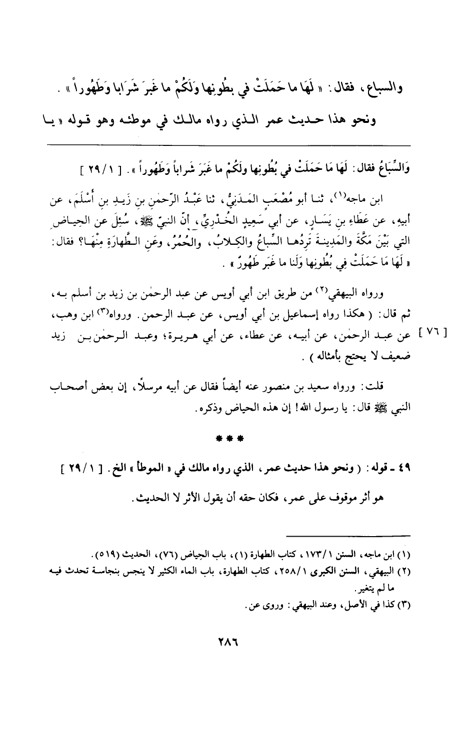 ابن ماجه (1)، ثنا أبو مُصْعَبٍ المَدَنِيُّ، ثنا عَبْدُ الرَّحمنِ بنِ زَيدِ بنِ أَسْلَمَ، عن أبيهِ، عن عَطَاءِ بنِ يَسَارٍ، عن أبي سَعِيدٍ الخُدْرِيِّ أنّ النبيّ - صلى الله عليه وسلم -، سُئِلَ عن الحِياضِ التي بَيْنَ مَكَّةَ والمَدِينةَ تَرِدُها السِّباعُ والكِلابُ، والحُمُرُ، وعَنِ الطَّهارَةِ مِنْهَا؟ فقال: "لَهَا مَا حَمَلَتْ فِي بُطُونها وَلَنا ما غَبَر طَهُورٌ".