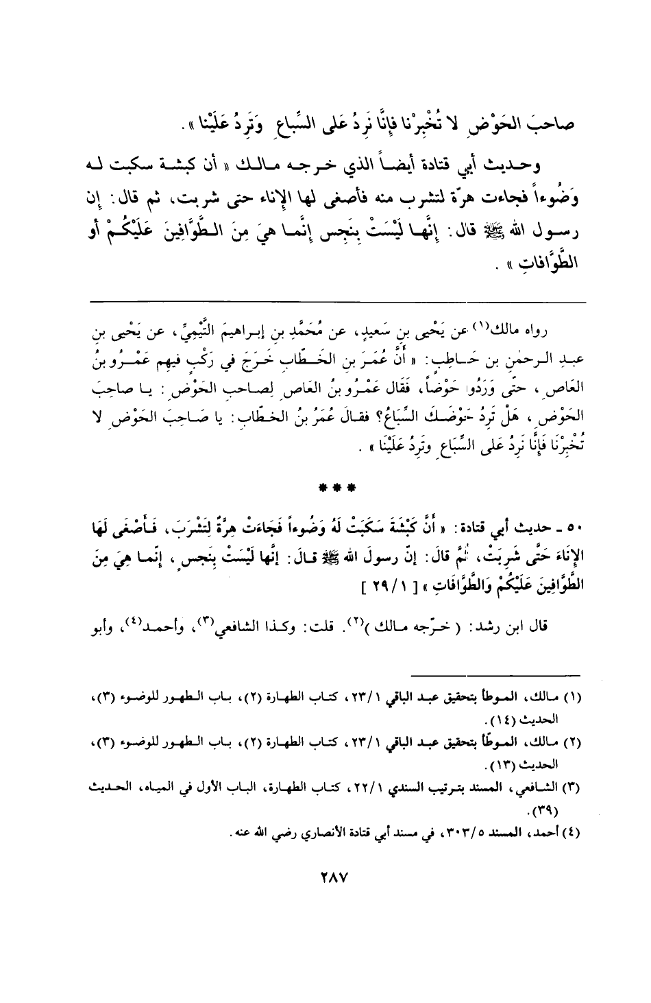 50 - حديث أبي قتادة: "أنَّ كَبْشةَ سَكبَتْ لَة وَضُوءًا فَجَاءَتْ هِرةَ لِتشرَبَ، فَأصْغَى لَهَا الإِنَاءَ حَتَّى شَرِبَتْ، ثمَّ قالَ: إن رسولَ الله - صلى الله عليه وسلم - قالَ: إنَّها لَيْسَتْ بِنَجس، إنَّما هىَ مِنَ الطَوَّافِينَ عَلَيْكُمْ وَالطَوَّافَاتِ".