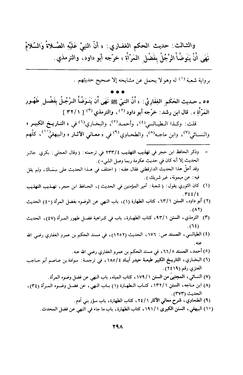 55 - حديث الحَكَمِ الغِفَارِي: "أنَّ النبيّ - صلى الله عليه وسلم - نَهَى أن يَتَوَضَّأ الرَّجُلُ بِفَضْلِ طَهُورِ المَرْأةِ". قال ابن رشد: خرّجه أبو داود، والترمذي.