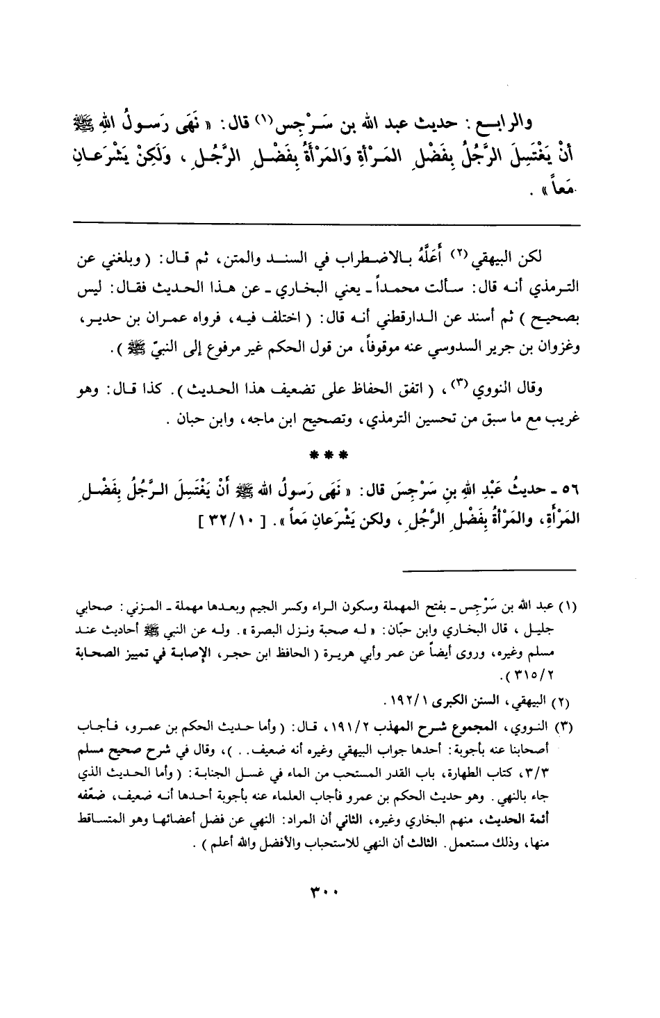 56 - حديثُ عَبْدِ اللهِ بنِ سَرْجِس قال: "نَهَى رسولُ الله - صلى الله عليه وسلم - أنْ يَغْتَسِلَ الرَّجُلُ بِفَضْل المَرْأةِ، والمَرْأةُ بِفَضْلِ الرَّجُلِ، ولكن يَشْرَعانِ مَعًا".