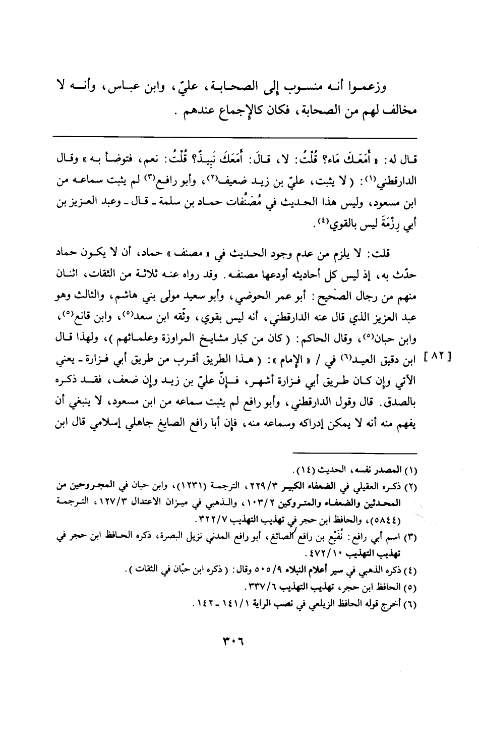 قلت: لا يلزم من عدم وجود الحديث في "مصنف" حماد، أن لا يكون حماد حدّث به، إذ ليس كل أحاديثه أودعها مصنفه. وقد رواه عنه ثلاثة من الثقات، اثنان منهم من رجال الصحيح: أبو عمر الحوضي، وأبو سعيد مولى بني هاشم، والثالث وهو عبد العزيز الذي قال عنه الدارقطني، أنه ليس بقوي، وثّقه ابن سعد، وابن قانع، وابن حبان، وقال الحاكم: (كان من كبار مشايخ المراوزة وعلمائهم)، ولهذا قال ابن دقيق العيد في "الإمام": (هذا الطريق أقرب من طريق أبي فزارة -يعني الآتي وإن كان طريق أبي فزارة أشهر، فإنّ عليّ بن زيد وإن ضعف، فقد ذكره بالصدق. قال وقول الدارقطني، وأبو رافع لم يثبت سماعه من ابن مسعود، لا ينبغي أن يفهم منه أنه لا يمكن إدراكه وسماعه منه، فإن أبا رافع الصايغ جاهلي إسلامي قال ابن