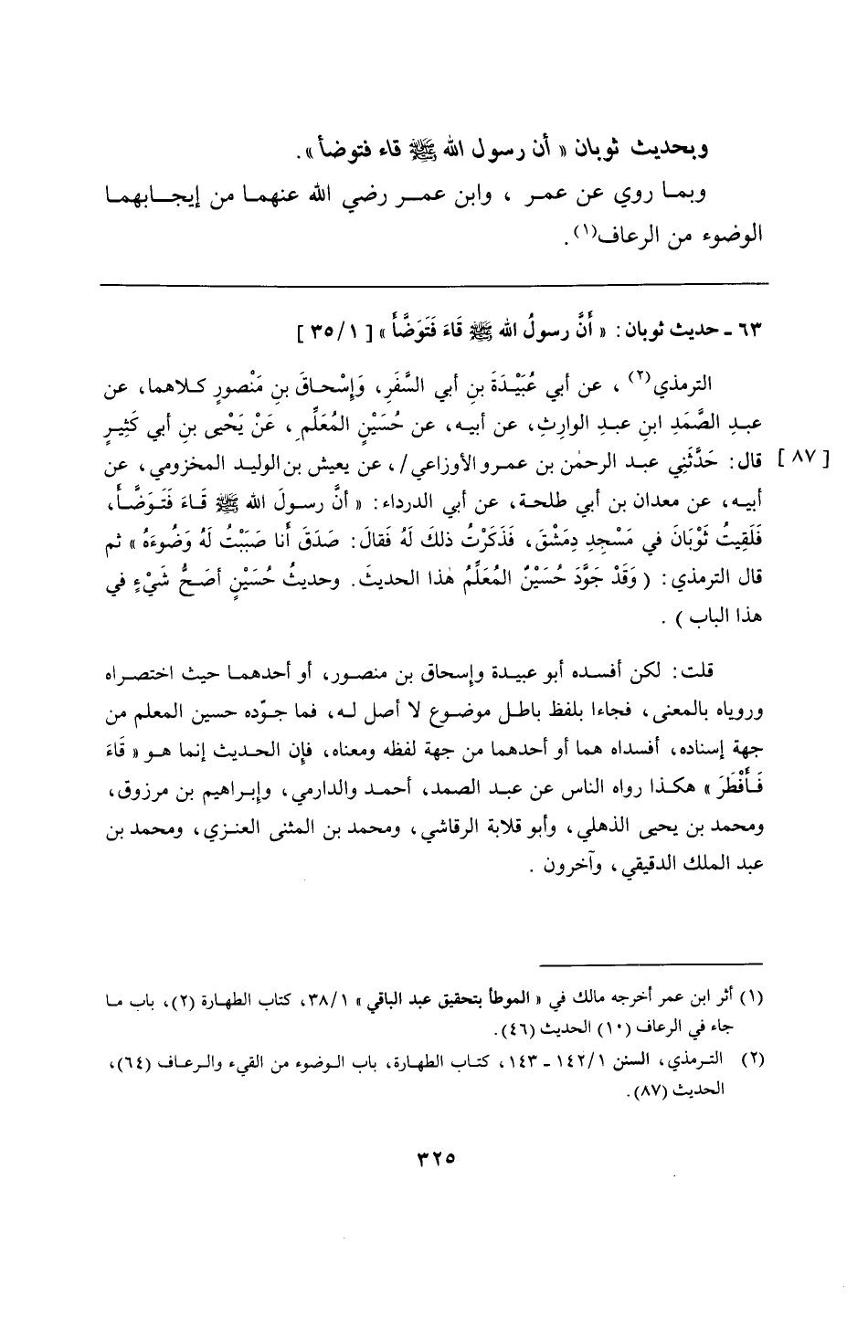 الترمذي، عن أبي عُبَيْدَةَ بنِ أبي السَّفَرِ، وَإِسْحاقَ بنِ مَنْصورٍ كلاهما، عن عبدِ الصَّمَدِ ابنِ عبدِ الوارِثِ، عن أبيه، عن حُسَيْنٍ المُعلَّمِ، عَنْ يَحْيى بنِ أبي كَثِيرٍ قال: حَدَّثَنِي عبد الرحمن بن عمرو الأوزاعي، عن يعيش بن الوليد المخزومي، عن أبيه، عن معدان بن أبي طلحة، عن أبي الدرداء: "أنَّ رسولَ الله - صلى الله عليه وسلم - قَاءَ فَتَوَضَّأَ، فَلَقِيتُ ثَوْبَانَ في مَسْجِدِ دِمَشْقَ، فَذَكَرْتُ ذلكَ لَهُ فَقالَ: صَدَقَ أَنا صَبَبْتُ لَهُ وَضُوءَهُ" ثم قال الترمذي: (وَقَدْ جَوَّدَ حُسَيْن المُعَلَّمُ هذا الحديثَ. وحديثُ حُسَيْنٍ أصَحُّ شَيْءٍ في هذا الباب).