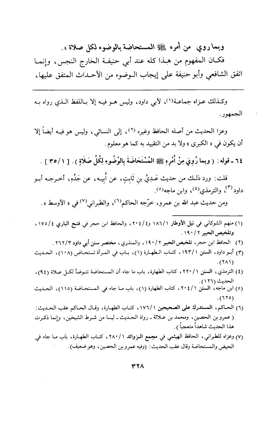 64 - قوله: (وبما رُوِيَ مِنْ أَمْرِهِ - صلى الله عليه وسلم - المُسْتَحَاضَةَ بِالوُضُوءِ لِكُلِّ صَلاَةٍ).