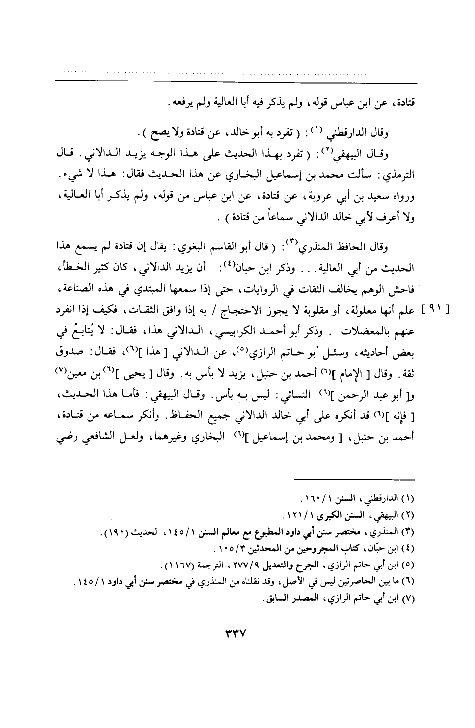 وقال الحافظ المنذري: (قال أبو القاسم البغوي: يقال إن قتادة لم يسمع هذا الحديث من أبي العالية. . . . وذكر ابن حبان: أن يزيد الدالاني، كان كثير الخطأ، فاحش الوهم يخالف الثقات في الروايات، حتى إذا سمعها المبتدي في هذه الصناعة، علم أنها معلولة، أو مقلوبة لا يجوز الاحتجاج به إذا وافق الثقات، فكيف إذا انفرد عنهم بالمعضلات. وذكر أبو أحمد الكرابيسي، الدالاني هذا، فقال: لا يُتابعُ في بعض أحاديثه، وسئل أبو حاتم الرازي، عن الدالاني هذا، فقال: صدوق ثقة. وقال الإِمام أحمد بن حنبل، يزيد لا بأس به. وقال يحيى بن معين وأبو عبد الرحمن النسائي: ليس به بأس. وقال البيهقي: فأما هذا الحديث، فإِنه قد أنكره على أبي خالد الدالاني جميع الحفاظ. وأنكر سماعه من قتادة، أحمد بن حنبل، ومحمد بن إسماعيل البخاري وغيرهما، ولعل الشافعي - رضي