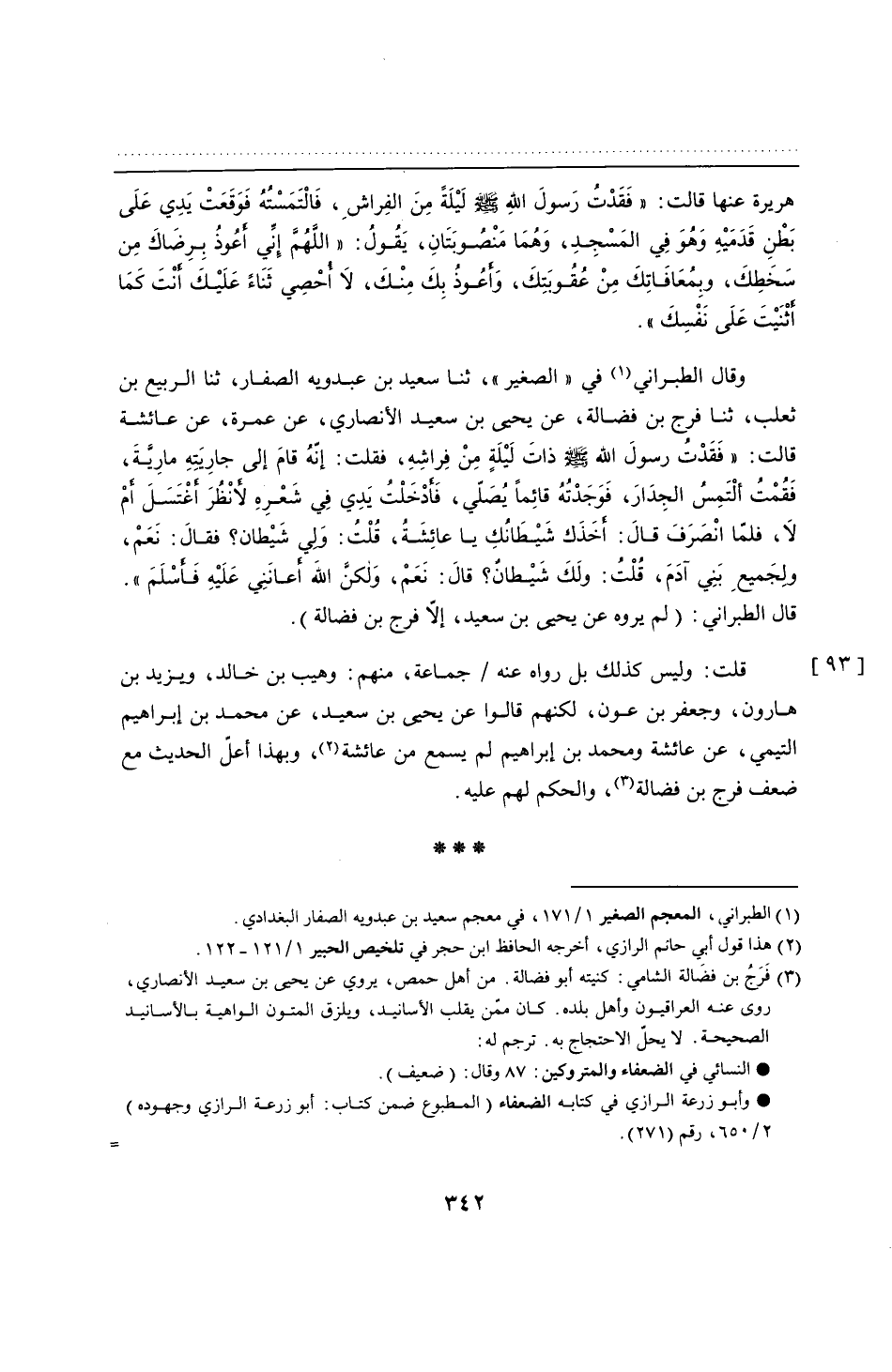 وقال الطبراني في "الصغير"، ثنا سعيد بن عبدويه الصفار، ثنا الربيع بن ثعلب، ثنا فرج بن فضالة، عن يحيى بن سعيد الأنصاري، عن عمرة، عن عائشة قالت: "فَقَدْتُ رسولَ الله - صلى الله عليه وسلم - ذاتَ لَيْلَةٍ مِنْ فِراشِهِ، فقلت: إنّهُ قامَ إلى جارِيَتِهِ ماريَّةَ، فَقُمْتُ ألْتَمِسُ الجِدَارَ، فَوَجَدْتُهُ قائِمًا يُصَلّي، فَأدْخَلْتُ يَدي فِي شَعْرِهِ لأنْظُرَ أَغتَسَلَ أَم لَا، فلما انْصَرَفَ قالَ: أَخَذَك شَيْطَانُكِ يا عائِشَةُ، قُلْتُ: وَلي شَيْطان؟ فقالَ: نَعَمْ، ولِجَميعِ بَنِي آدَمَ، قلْتُ: ولَكَ شَيْطانٌ؟ قالَ: نَعَمْ، وَلكنَّ اللهَ أَعانَنِي عَلَيْهِ فَأسْلَم". قال الطبراني: (لم يروه عن يحيى بن سعيد، إلّا فرج بن فضالة).