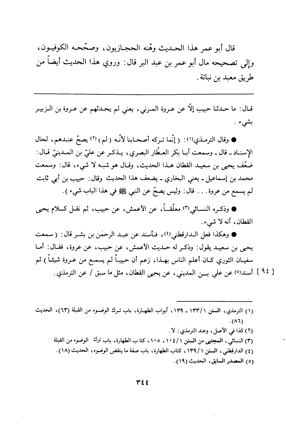• وهكذا فعل الدارقطني، فأسند عن عبد الرحمن بن بشر قال: (سمعت يحيى بن سعيد يقول: وذكر له حديث الأعمش، عن حبيب، عن عروة، فقال: أما سفيان الثوري كان أعلم الناس بهذا، زعم أن حبيبًا لم يسمع من عروة شيئًا) ثم أسند عن علي بن المديني، عن يحيى القطان، مثل ما سبق عن الترمذي.