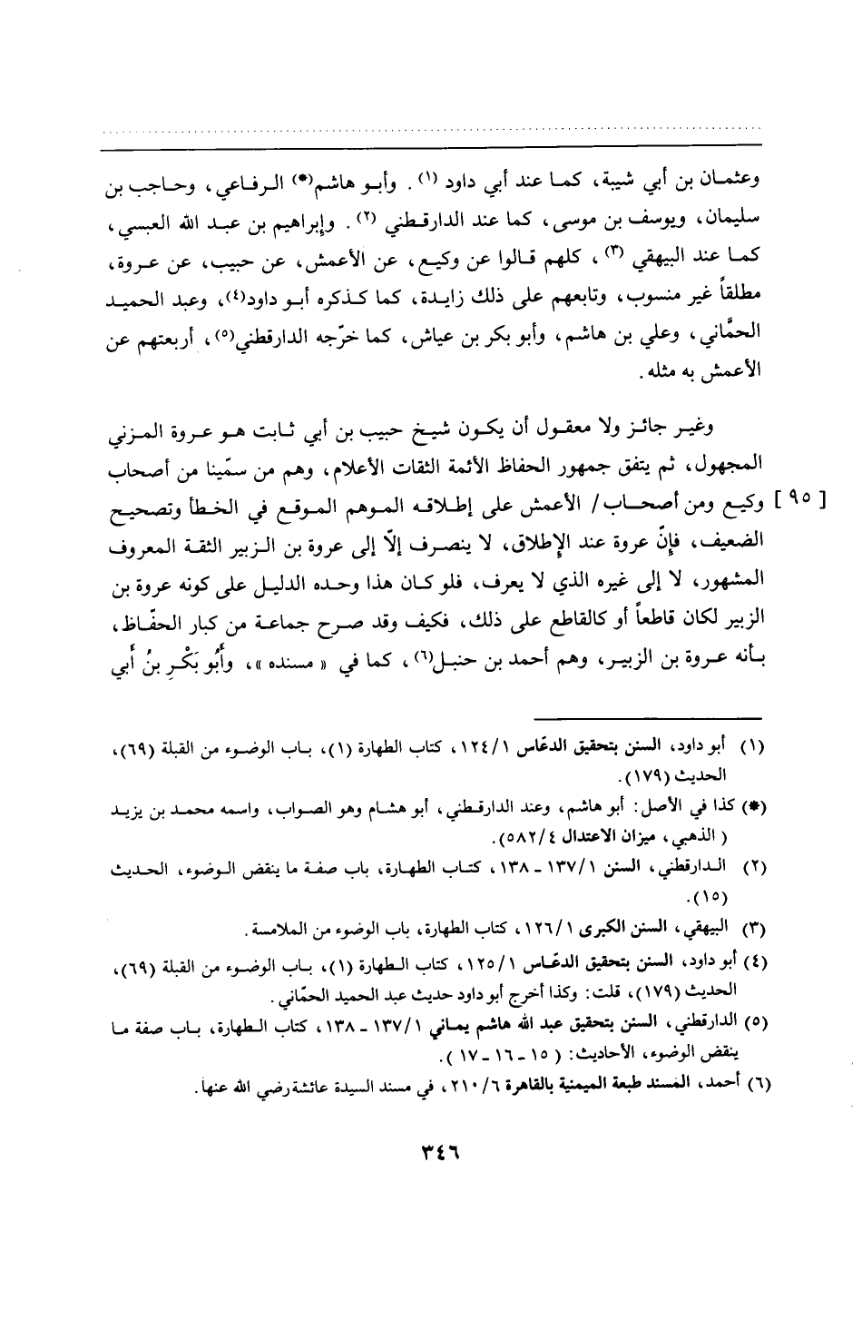 وغير جائز ولا معقول أن يكون شيخ حبيب بن أبي ثابت هو عروة المزني المجهول، ثم يتفق جمهور الحفاظ الأئمة الثقات الأعلام، وهم من سمّينا من أصحاب وكيع ومن أصحاب الأعمش على إطلاقه الموهم الموقع في الخطأ وتصحيح الضعيف، فإنّ عروة عند الإطلاق، لا ينصرف إلّا إلى عروة بن الزبير الثقة المعروف المشهور، لا إلى غيره الذي لا يعرف، فلو كان هذا وحده الدليل على كونه عروة بن الزبير لكان قاطعًا أو كالقاطع على ذلك، فكيف وقد صرح جماعة من كبار الحفّاظ، بأنه عروة بن الزبير، وهم أحمد بن حنبل، كما في "مسنده"، وأَبو بَكْرِ بن أَبي