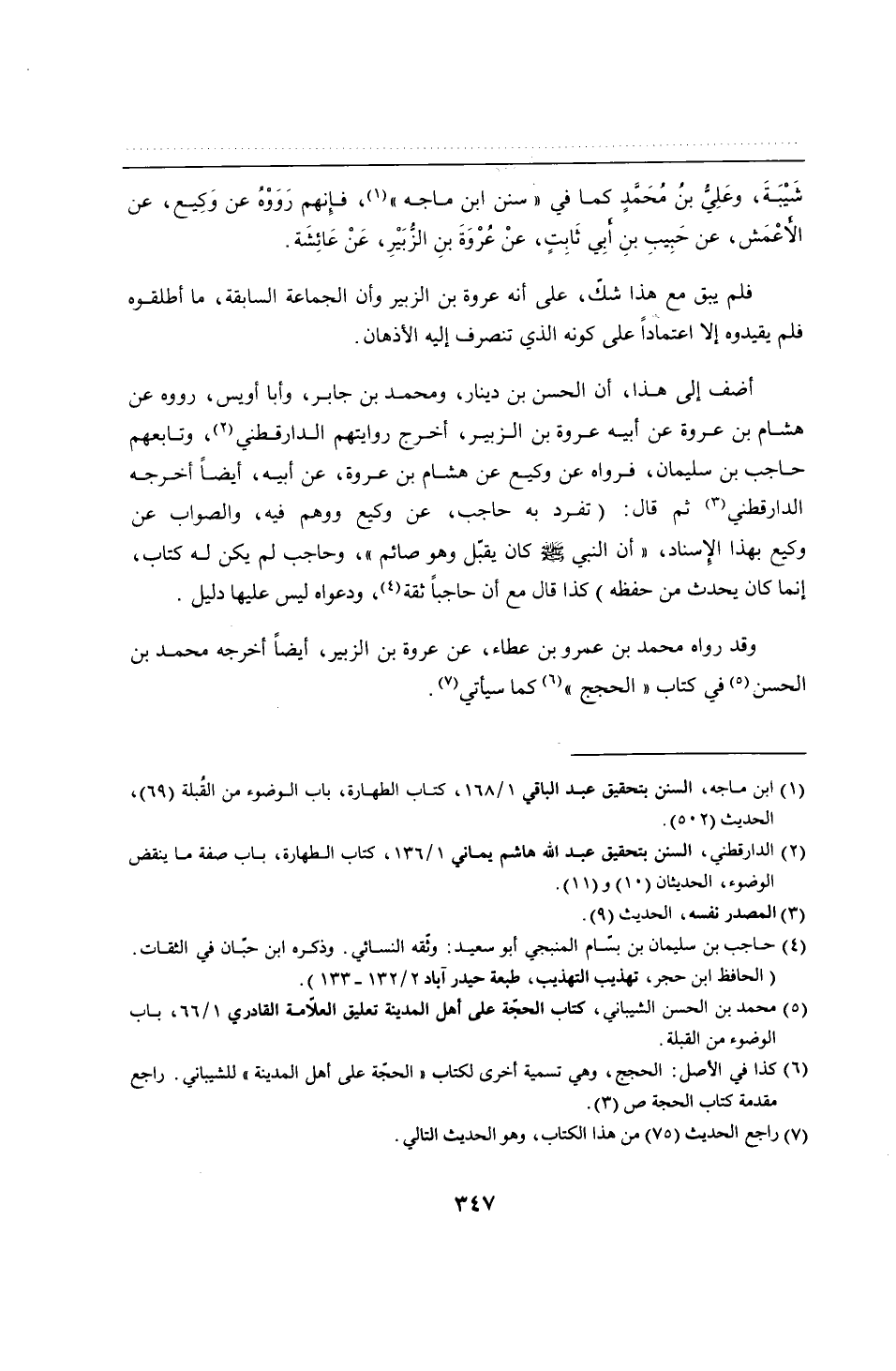 شَيْبَةَ، وعَلِيُّ بنُ مُحَمَّدٍ كما في "سنن ابن ماجه"، فإِنهم رَوَوْهُ عن وَكِيع، عن الأَعْمَش، عن حَبِيبِ بنِ أبِي ثَابِتٍ، عنْ عُرْوَةَ بنِ الزُّبَيْرِ، عَنْ عَائِشَة.