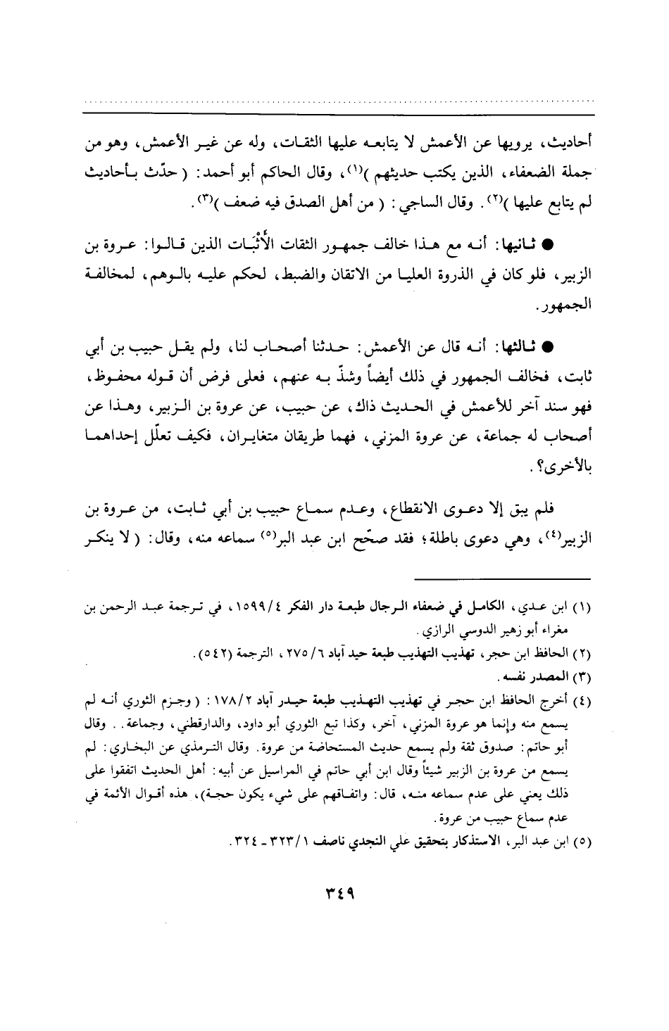 • ثالثها: أنه قال عن الأعمش: حدثنا أصحاب لنا، ولم يقل حبيب بن أبي ثابت، فخالف الجمهور في ذلك أيضًا وشذّ به عنهم، فعلى فرض أن قوله محفوظ، فهو سند آخر للأعمش في الحديث ذاك، عن حبيب، عن عروة بن الزبير، وهذا عن أصحاب له جماعة، عن عروة المزني، فهما طريقان متغايران، فكيف تعلّل إحداهما بالأخرى؟.