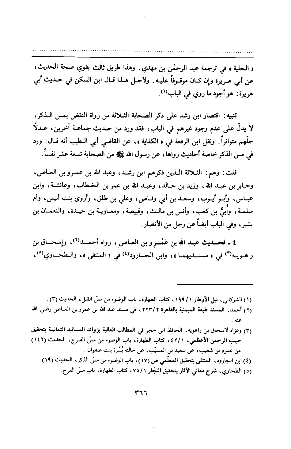تنبيه: اقتصار ابن رشد على ذكر الصحابة الثلاثة من رواة النقض بمس الذكر، لا يدلّ على عدم وجود غيرهم في الباب، فقد ورد من حديث جماعة آخرين، عدلًا جلّهم متواترًا. ونقل ابن الرفعة في "الكفاية"، عن القاضي أبي الطيب أنه قال: ورد في مس الذكر خاصة أحاديث رواها، عن رسول الله - صلى الله عليه وسلم - من الصحابة تسعة عشر نفسًا.