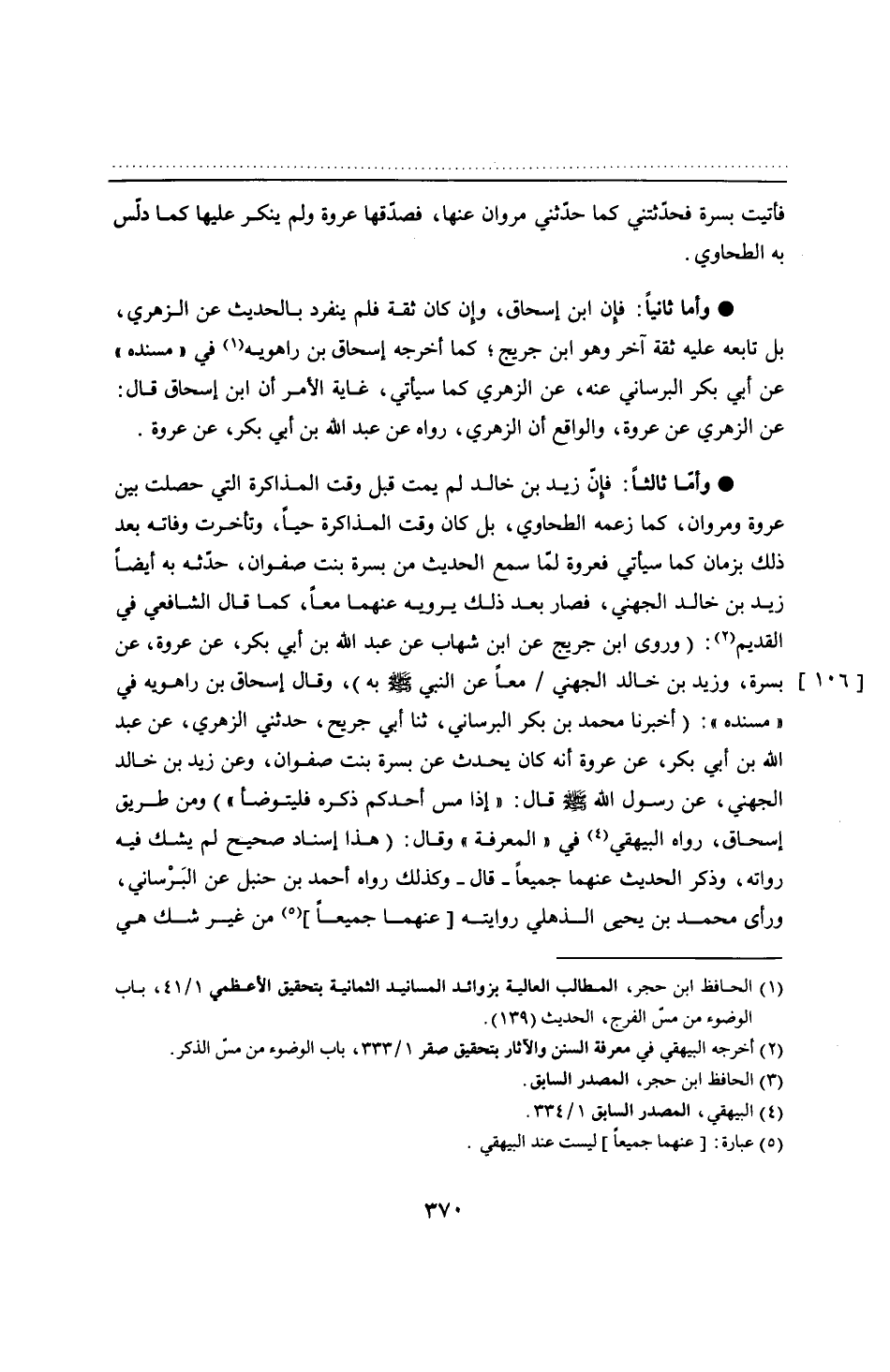 • وأمّا ثالثًا: فإن زيد بن خالد لم يمت قبل وقت المذاكرة التي حصلت بين عروة ومروان، كما زعمه الطحاوي، بل كان وقت المذاكرة حيًا، وتأخرت وفاته بعد ذلك بزمان كما سيأتي فعروة لمّا سمع الحديث من بسرة بنت صفوان، حدّثه به أيضًا زيد بن خالد الجهني، فصار بعد ذلك يرويه عنهما معًا، كما قال الشافعي في القديم: (وروى ابن جريج عن ابن شهاب عن عبد الله بن أبي بكر، عن عروة، عن بسرة، وزيد بن خالد الجهني معًا عن النبي - صلى الله عليه وسلم - به)، وقال إسحاق بن راهويه في "مسنده": (أخبرنا محمد بن بكر البرساني، ثنا أبي جريح، حدثني الزهري، عن عبد الله بن أبي بكر، عن عروة أنه كان يحدث عن بسرة بنت صفوان، وعن زيد بن خالد الجهني، عن رسول الله - صلى الله عليه وسلم - قال: (إذا مس أحدكم ذكره فليتوضأ") ومن طريق إسحاق، رواه البيهقي في "المعرفة" وقال: (هذا إسناد صحيح لم يشك فيه رواته، وذكر الحديث عنهما جميعًا -قال- وكذلك رواه أحمد بن حنبل عن البَرْساني، ورأى محمد بن يحيى الذهلي روايته عنهما جميعًا من غير شك هي