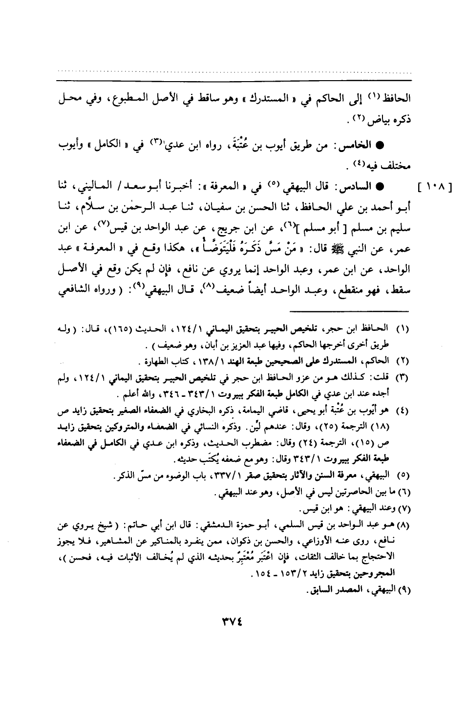 • السادس: قال البيهقي في "المعرفة": أخبرنا أبو سعد الماليني، ثنا أبو أحمد بن علي الحافظ، ثنا الحسن بن سفيان، ثنا عبد الرحمن بن سلَّام، ثنا سليم بن مسلم أبو مسلم، عن ابن جريج، عن عبد الواحد بن قيس، عن ابن عمر، عن النبي - صلى الله عليه وسلم - قال: "مَنْ مسَّ ذَكَرَهُ فَلْيَتَوَضَّأ"، هكذا وقع في "المعرفة" عبد الواحد، عن ابن عمر، وعبد الواحد إنما يروي عن نافع، فإن لم يكن وقع في الأصل سقط، فهو منقطع، وعبد الواحد أيضًا ضعيف، قال البيهقي: (ورواه الشافعي