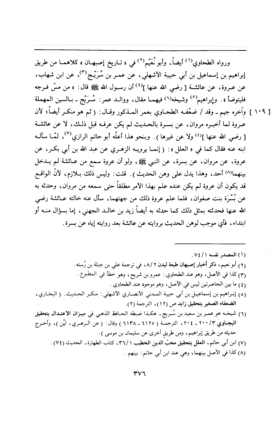 ورواه الطحاوي أيضًا، وأبو نُعَيْم في "تاريخ إصبهان" كلاهما من طريق إبراهيم بن إسماعيل بن أبي حبيبة الأشهلي، عن عمر بن سُرَيْج، عن ابن شهاب، عن عروة، عن عائشة -رضي الله عنها- أن رسول الله - صلى الله عليه وسلم -قال: "من مسّ فرجه فليتوضأ". وإبراهيم وشيخه فيهما مقال، ووالد عمر: سُرَيْج -بالسين المهملة وآخره جيم- وقد ضعّفه الطحاوي بعمر المذكور وقال: (ثم هو منكر أيضًا؛ لأن عروة لما أخبره مروان، عن بسرة بالحديث لم يكن عرفه قبل ذلك، لا عن عائشة -رضي الله عنها- ولا عن غيرها). وبنحو هذا أعلّه أبو حاتم الرازي، لمّا سأله ابنه عنه فقال كما في "العلل": (إنما يرويه الزهري عن عبد الله بن أبي بكر، عن عروة، عن مروان، عن بسرة، عن النبي - صلى الله عليه وسلم -، ولو أن عروة سمع من عائشة لم يدخل بينهما أحد، وهذا يدل على وهن الحديث). قلت: وليس ذلك بلازم، لأنّ الواقع قد يكون أن عروة لم يكن عنده علم بهذا الأمر مطلقًا حتى سمعه من مروان، وحدثه به عن بُسْرَة بنت صفوان، فلما علم عروة ذلك من جهتهما، سأل عنه خالته عائشة -رضي الله عنها- فحدثته بمثل ذلك كما حدثه به أيضًا زيد بن خالد الجهني، إما بسؤال منه أو ابتداء، فأي موجب لوهن الحديث بروايته عن عائشة بعد روايته إياه عن بسرة.