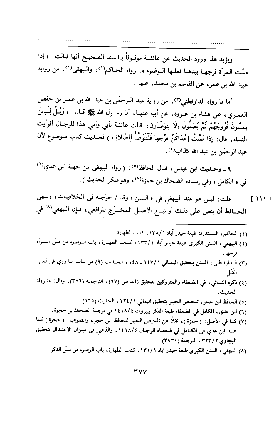 أما ما رواه الدارقطني، من رواية عبد الرحمن بن عبد الله بن عمر بن حفص العمري، عن هشام بن عروة، عن أبيه عنها، أن رسول الله - صلى الله عليه وسلم - قال: "ويْلٌ للَّذينَ يَمَسُّونَ فرُوجَهُمْ ثمَّ يُصَلُّونَ وَلَا يَتَوَضأون، قالت عائشة بأبي وأمي هذا للرجال أفرأيت النساء، قال: إذا مَسَّتْ إحْدَاكُنَّ فَرْجَهَا فَلْتَتَوَضَّأ لِلصَّلَاةِ" فحديث كذب موضوع لأن عبد الرحمن بن عبد الله كذاب.