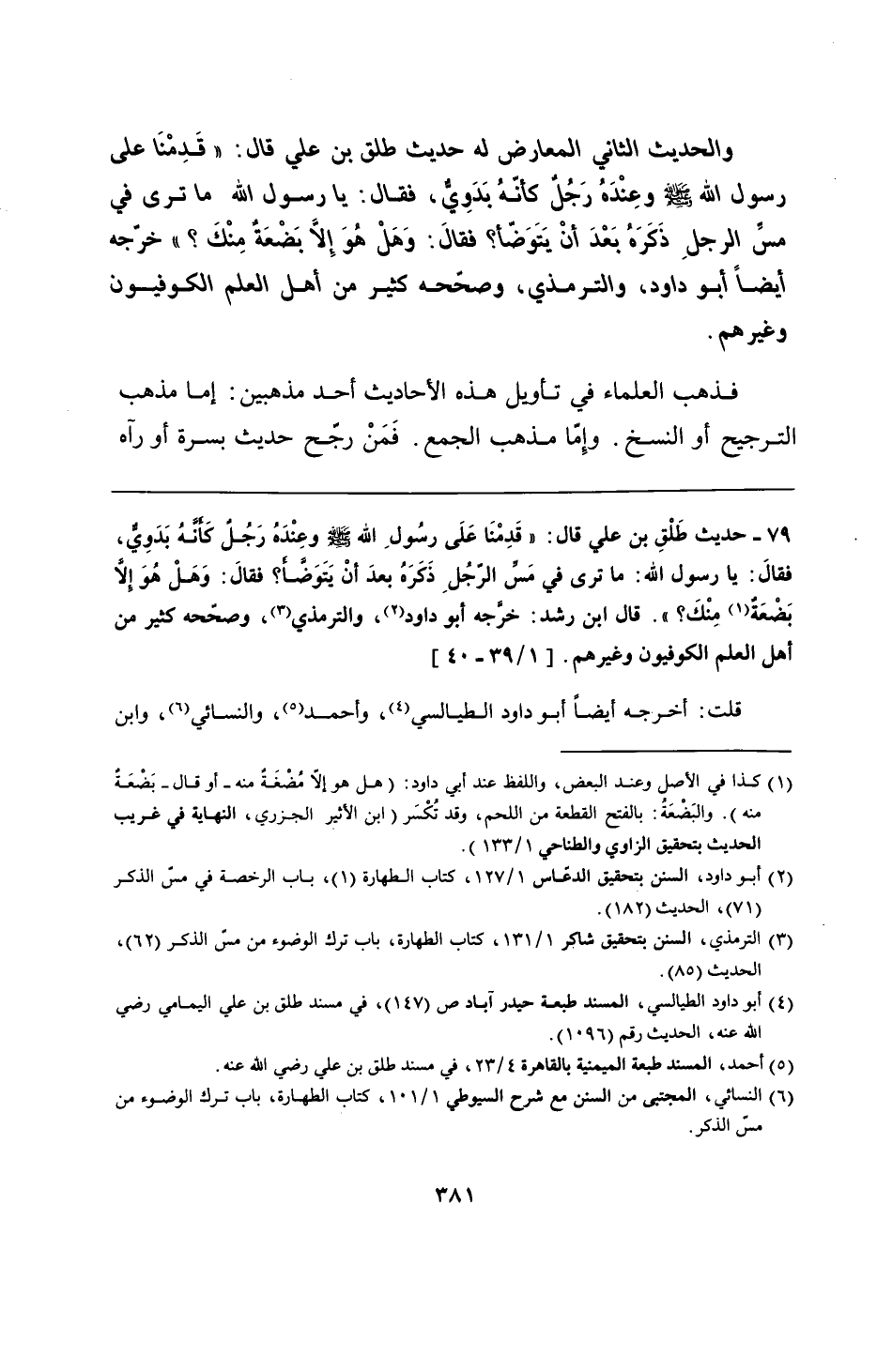 79 - حديث طَلْقِ بن علي قال: "قَدِمْنَا عَلَى رسُولِ الله - صلى الله عليه وسلم - وعِنْدَهُ رجُلٌ كَأنَّهُ بَدَوِيُّ، فقالَ: يا رسول الله: ما ترى في مَسَّ الرّجُلِ ذَكَرَهُ بعدَ أنْ يَتَوَضَّأ؟ فقالَ: وَهَلْ هُوَ إلَّا بَضْعَةٌ مِنْكَ؟ ". قال ابن رشد: خرَّجه أبو داود، والترمذي، وصحّحه كثير من أهل العلم الكوفيون وغيرهم.
