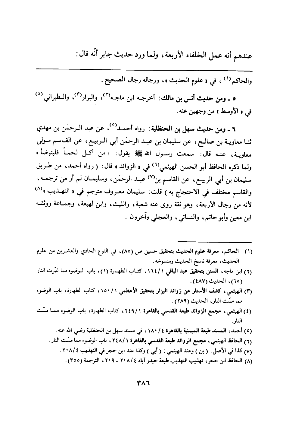 6 - ومن حديث سهل بن الحنظلية: رواه أحمد، عن عبد الرحمن بن مهدي ثنا معاوية بن صالح، عن سليمان بن عبد الرحمن أبي الربيع، عن القاسم مولى معاوية، عنه قال: سمعت رسول الله - صلى الله عليه وسلم - يقول: "من أكل لحمًا فليتوضأ" ولما ذكره الحافظ أبو الحسن الهيثمي في "الزوئد" قال: (رواه أحمد، من طريق سليمان بن أبي الربيع، عن القاسم بن عبد الرحمن، وسليمان لم أر من ترجمه، والقاسم مختلف في الاحتجاج به) قلت: سليمان معروف مترجم في "التهذيب" لأنه من رجال الأربعة، وهو ثقة روى عنه شعبة، والليث، وابن لهيعة، وجماعة ووثقه ابن معين وأبو حاتم، والنسائي، والعجلي وآخرون.