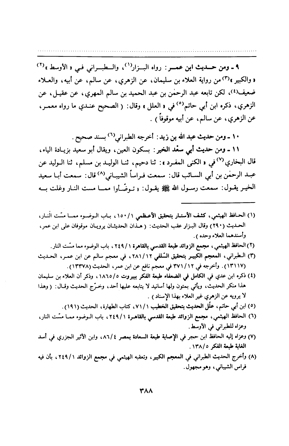 9 - ومن حديث ابن عمر: رواه البزار، والطبراني في "الأوسط" "والكبير" من رواية العلاء بن سليمان، عن الزهري، عن سالم، عن أبيه، والعلاء ضعيف، لكن تابعه عبد الرحمن بن عبد الحميد بن سالم المهري، عن عقيل، عن الزهري، ذكره ابن أبي حاتم في "العلل" وقال: (الصحيح عندي ما رواه معمر، عن الزهري، عن سالم، عن أبيه موقوفًا).