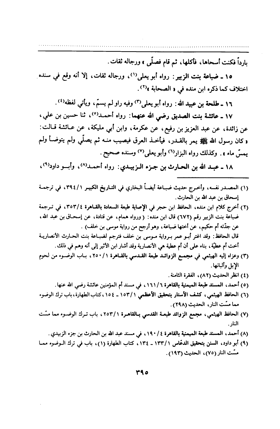 17 - عائشة بنت الصديق - رضي الله عنهما -: رواه أحمد، ثنا حسين بن علي، عن زائدة، عن عبد العزيز بن رفيع، عن عكرمة، وابن أبي مليكة، عن عائشة قالت: "كان رسول الله - صلى الله عليه وسلم - يمر بالقدر، فيأخذ العرق فيصيب منه ثم يصلّي ولم يتوضأ ولم يمسّ ماء". وكذلك رواه البزار وأبو يعلى وسنده صحيح.