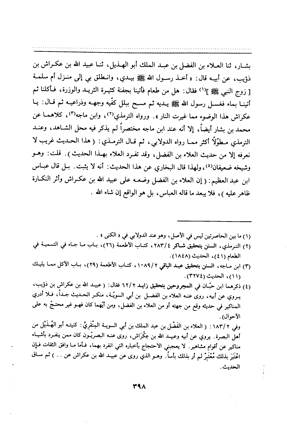 بشار، ثنا العلاء بن الفضل بن عبد الملك أبو الهذيل، ثنا عبيد الله بن عكراش بن ذؤيب، عن أبيه قال: "أخذ رسول الله - صلى الله عليه وسلم - بيدي، وانطلق بي إلى منزل أم سلمة [زوج النبي - صلى الله عليه وسلم -] فقال: هل من طعام فأتينا بجفنة كثيرة الثريد والوزرة، فأكلنا ثم أتينا بماء فغسل رسول الله - صلى الله عليه وسلم - يديه ثم مسح ببلل كفّيه وجهه وذراعيه ثم قال: يا عكراش هذا الوضوء مما غيرت النار". ورواه الترمذي، وابن ماجه، كلاهما عن محمد بن بشار أيضًا، إلا أنه عند ابن ماجه مختصرًا لم يذكر فيه محل الشاهد، وعند الترمذي مطوّلًا أكثر مما رواه الدولابي، ثم قال الترمذي: (هذا الحديث غريب لا نعرفه إلا من حديث العلاء بن الفضل، وقد تفرد العلاء بهذا الحديث). قلت: وهو وشيخه ضعيفان، ولهذا قال البخاري عن هذا الحديث: أنه لا يثبت. بل قال عباس ابن عبد العظيم: (إن العلاء بن الفضل وضعه على عبيد الله بن عكراش وأثر النكارة ظاهر عليه)، فلا يبعد ما قاله العباس، بل هو الواقع إن شاء الله.