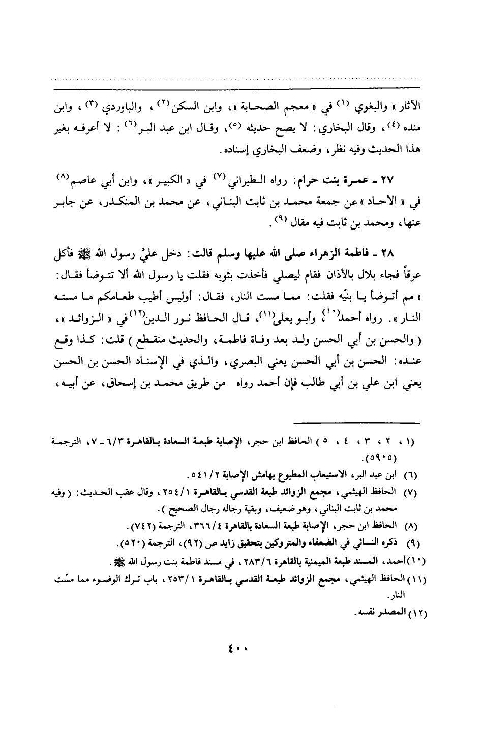 27 - عمرة بنت حرام: رواه الطبراني في "الكبير"، وابن أبي عاصم في "الآحاد" عن جمعة محمد بن ثابت البناني، عن محمد بن المنكدر، عن جابر عنها، ومحمد بن ثابت فيه مقال.