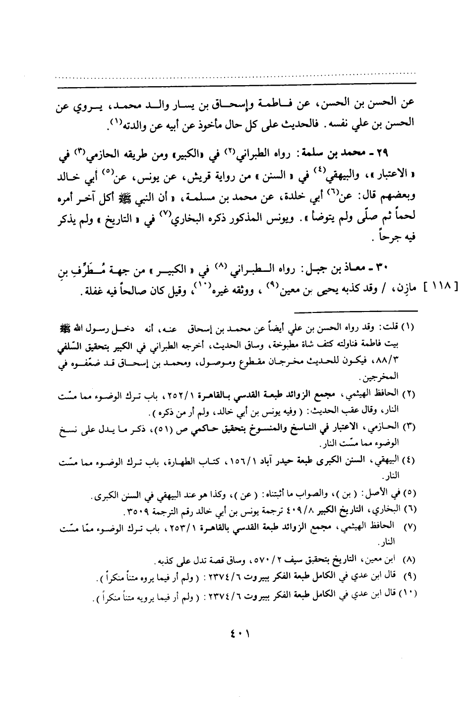 30 - معاذ بن جبل: رواه الطبراني في "الكبير" من جهة مُطَرِّفِ بنِ مازِن، وقد كذبه يحيى بن معين، ووثقه غيره، وقيل كان صالحًا فيه غفلة.