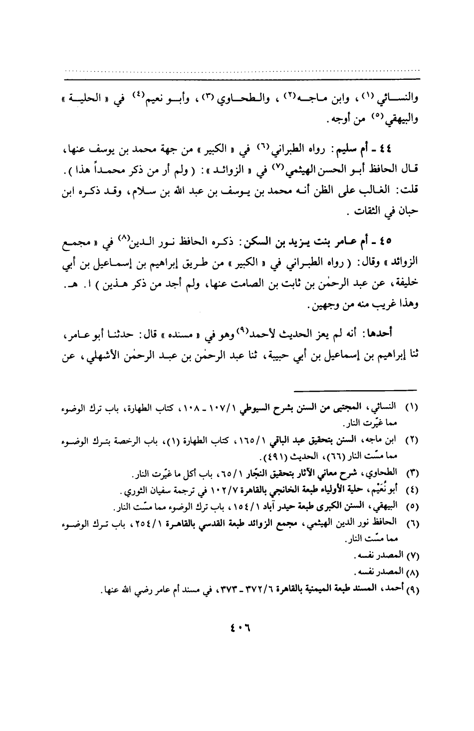45 - أم عامر بنت يزيد بن السكن: ذكره الحافظ نور الدين في "مجمع الزوائد" وقال: (رواه الطبراني في "الكبير" من طريق إبراهيم بن إسماعيل بن أبي خليفة، عن عبد الرحمن بن ثابت بن الصامت عنها، ولم أجد من ذكر هذين) ا. هـ. وهذا غريب منه من وجهين.
